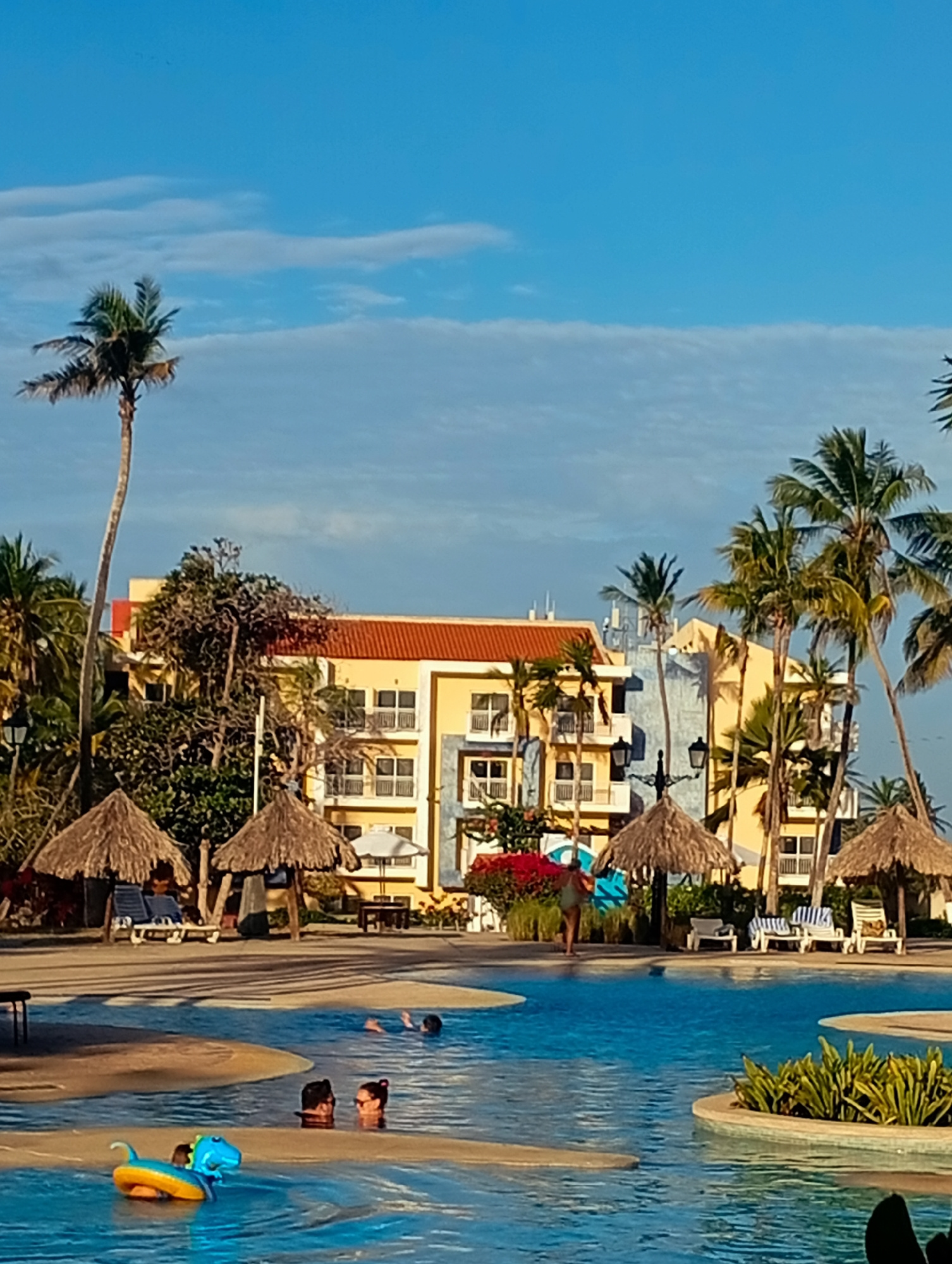 The image depicts a daytime scene at a resort-style swimming pool in Playa El Agua, Venezuela. Several individuals are present in the pool, including two people whose heads are visible above the water…read more