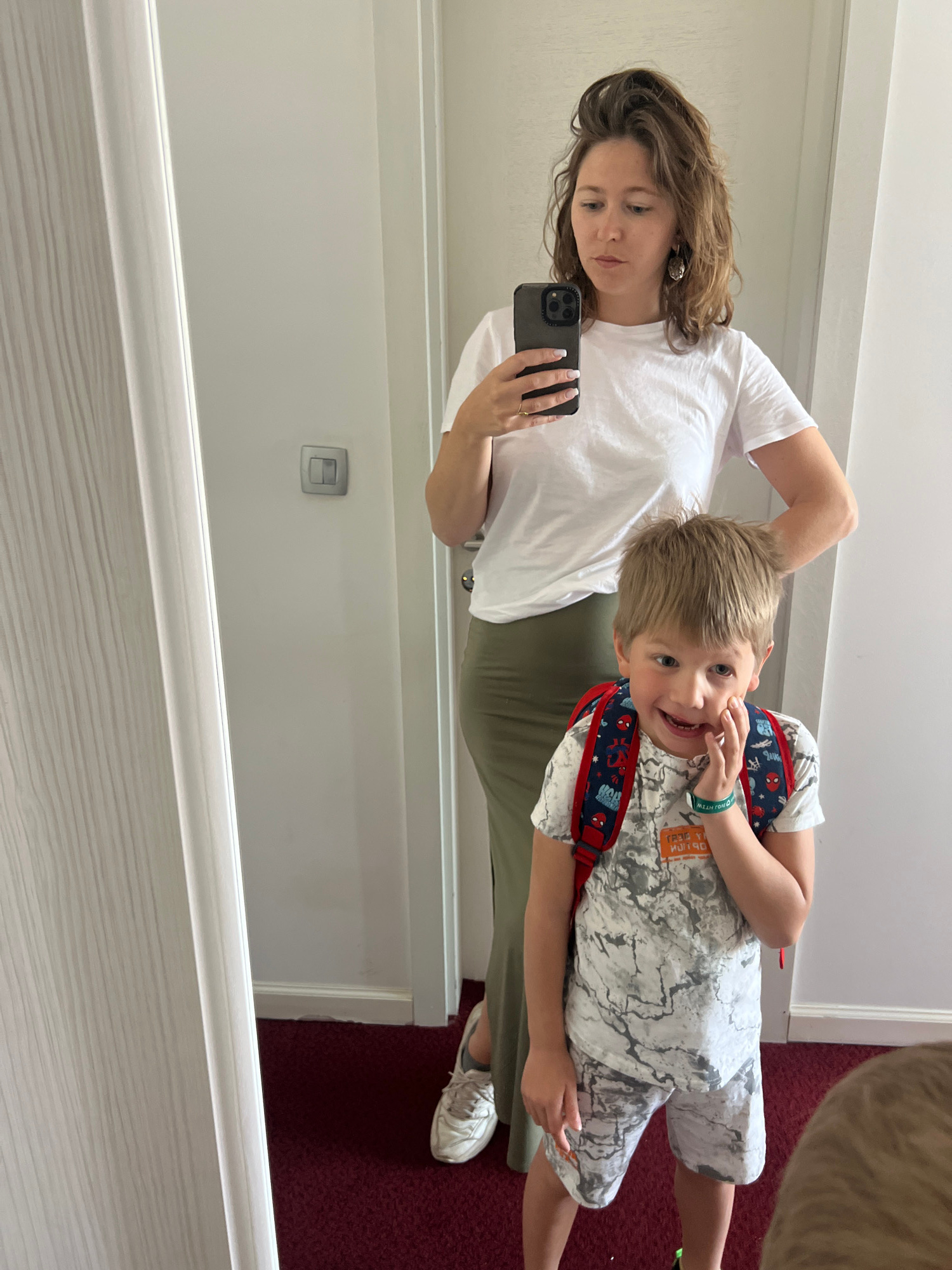 The image, taken in Petrovac centar, Montenegro, captures a mirror selfie of a woman and a young boy indoors. The setting appears to be a well-lit room or hallway, featuring a large mirror against a w…read more