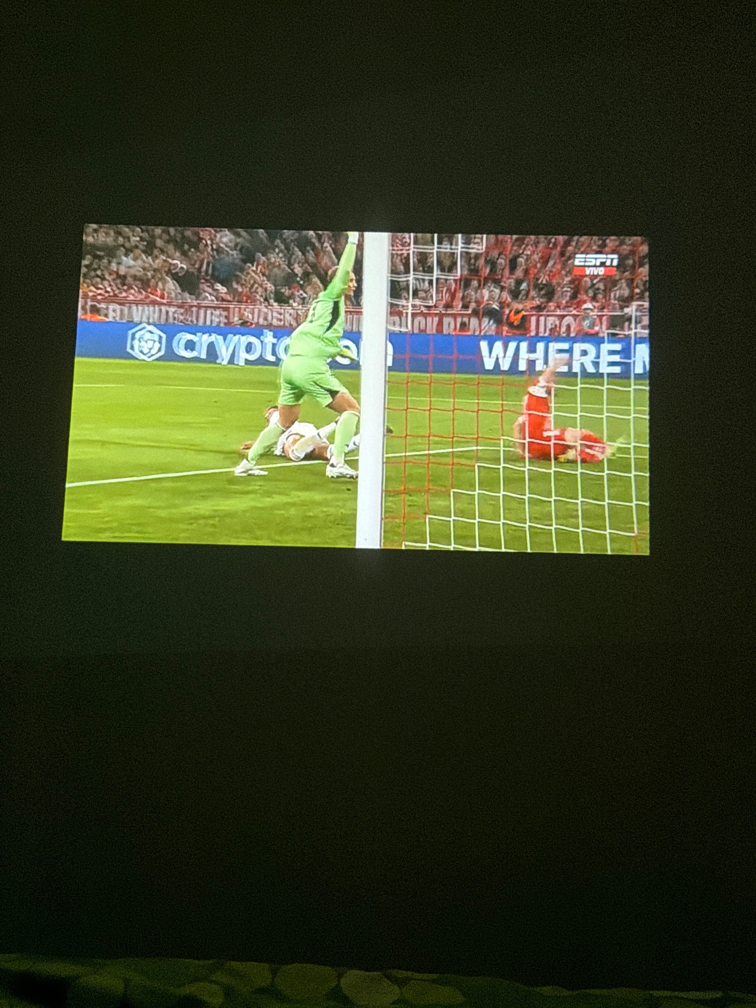 The image shows a soccer game being displayed on a screen. A player in red is in the goal being scored on. The opposing goalkeeper in green and white uniform is saving a shot. The advertisement on theβ¦read more