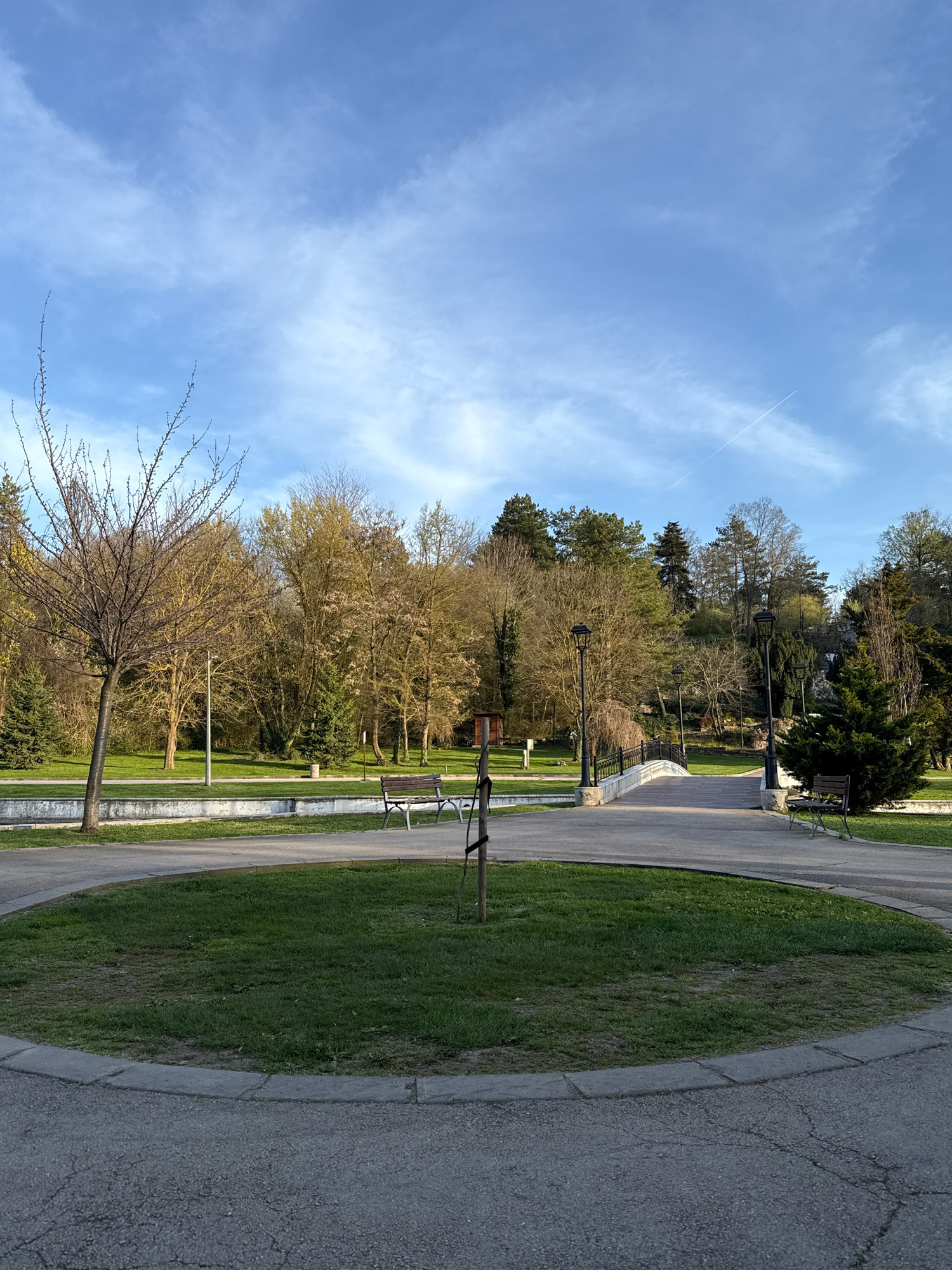 The image shows a park in Dobrich, Bulgaria. The scene captures a paved path curving along a circular grassy area. Along the path, there are several benches and lampposts. Deciduous trees with budding…read more