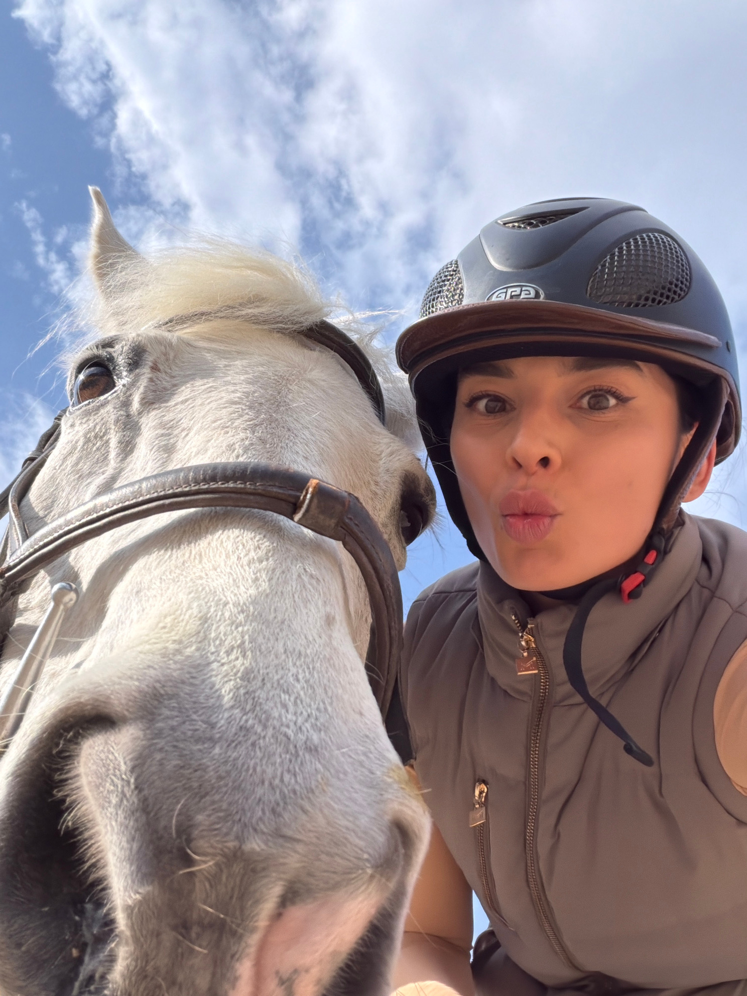 The image is a low-angle selfie featuring a woman wearing a black equestrian helmet and a gray padded vest, making a kissing face. Below her is a gray horse with a black bridle. The background revealsβ¦read more