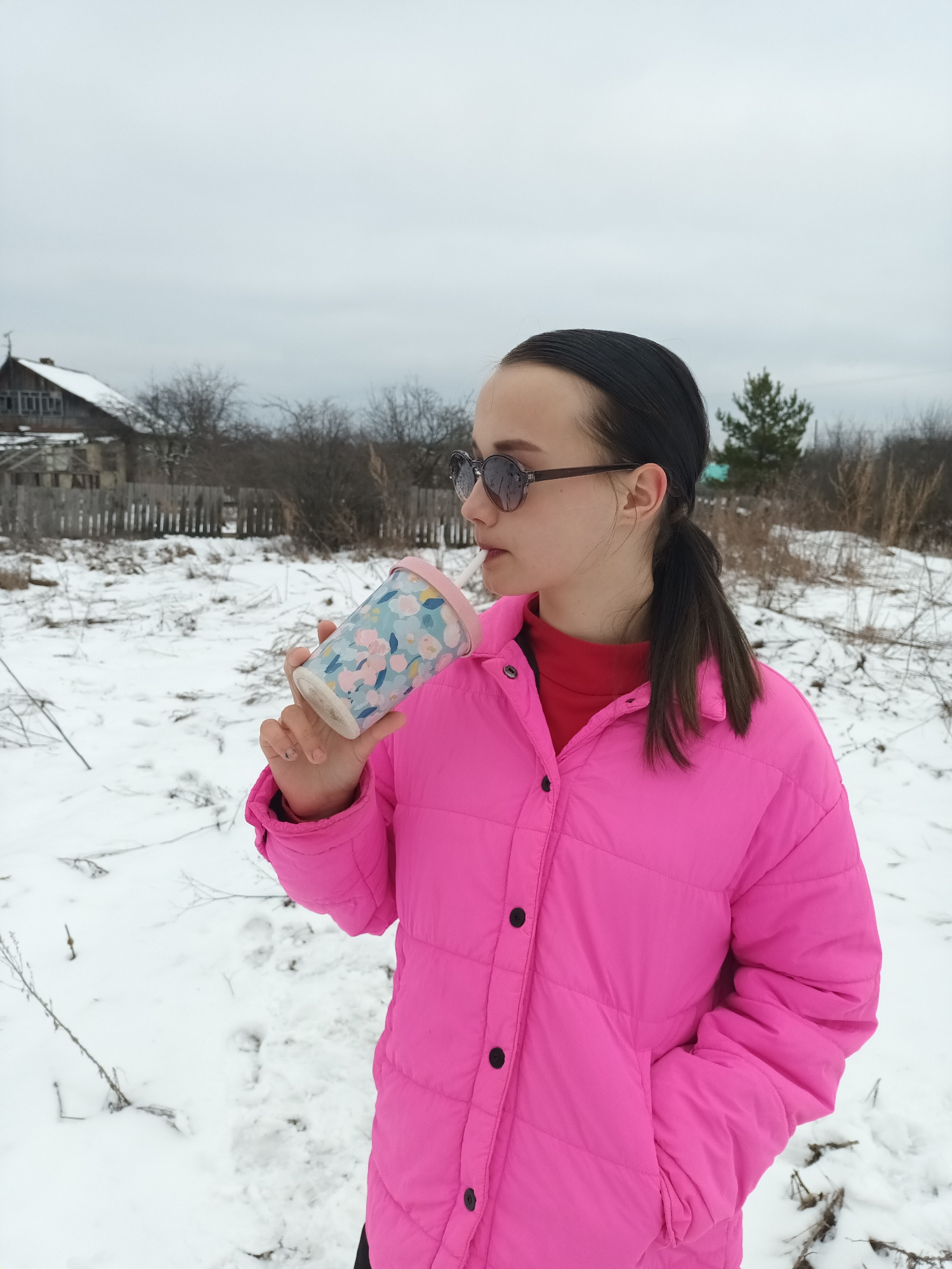 A woman with dark hair pulled back in a low ponytail, wearing sunglasses and a bright pink puffer jacket, is standing in a snow-covered area. She is holding a floral-patterned cup in her right hand an…read more