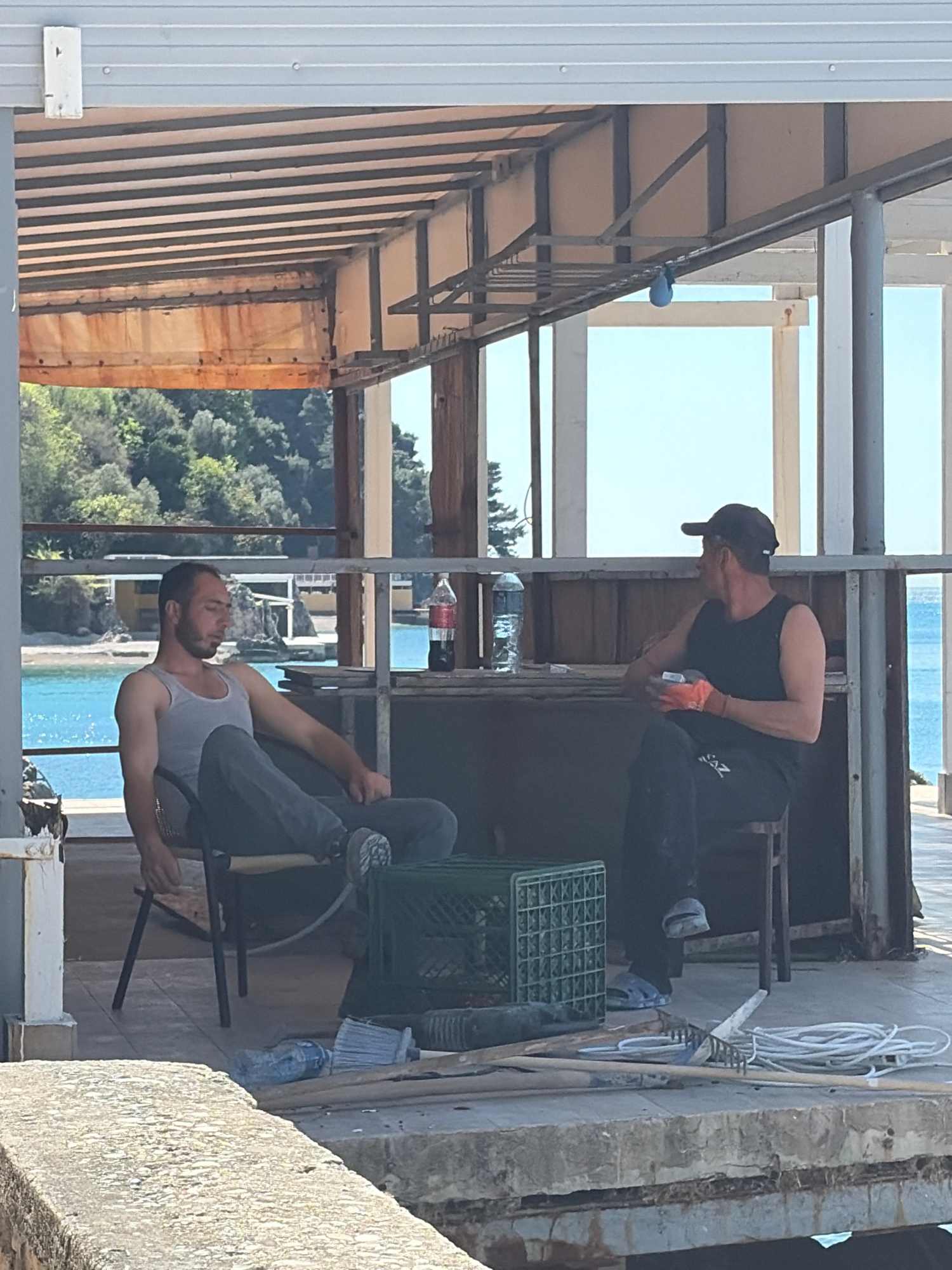 Two men appear to be doing construction work on a building structure. One man is wearing a black cap, black tank top, and dark pants, bending over, as if inspecting or working on something within the…read more