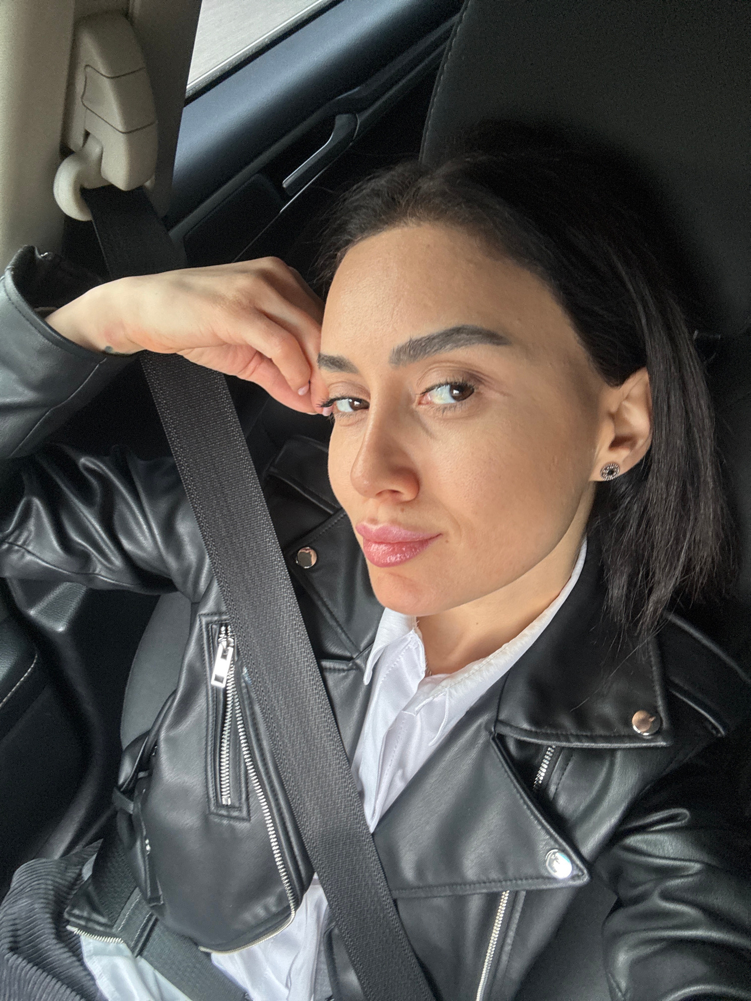 A woman with fair skin, dark hair, and light-colored eyes is seated in a car. She is wearing a black leather jacket over a white shirt, and a black seatbelt crosses her body. She has her hand near her…read more