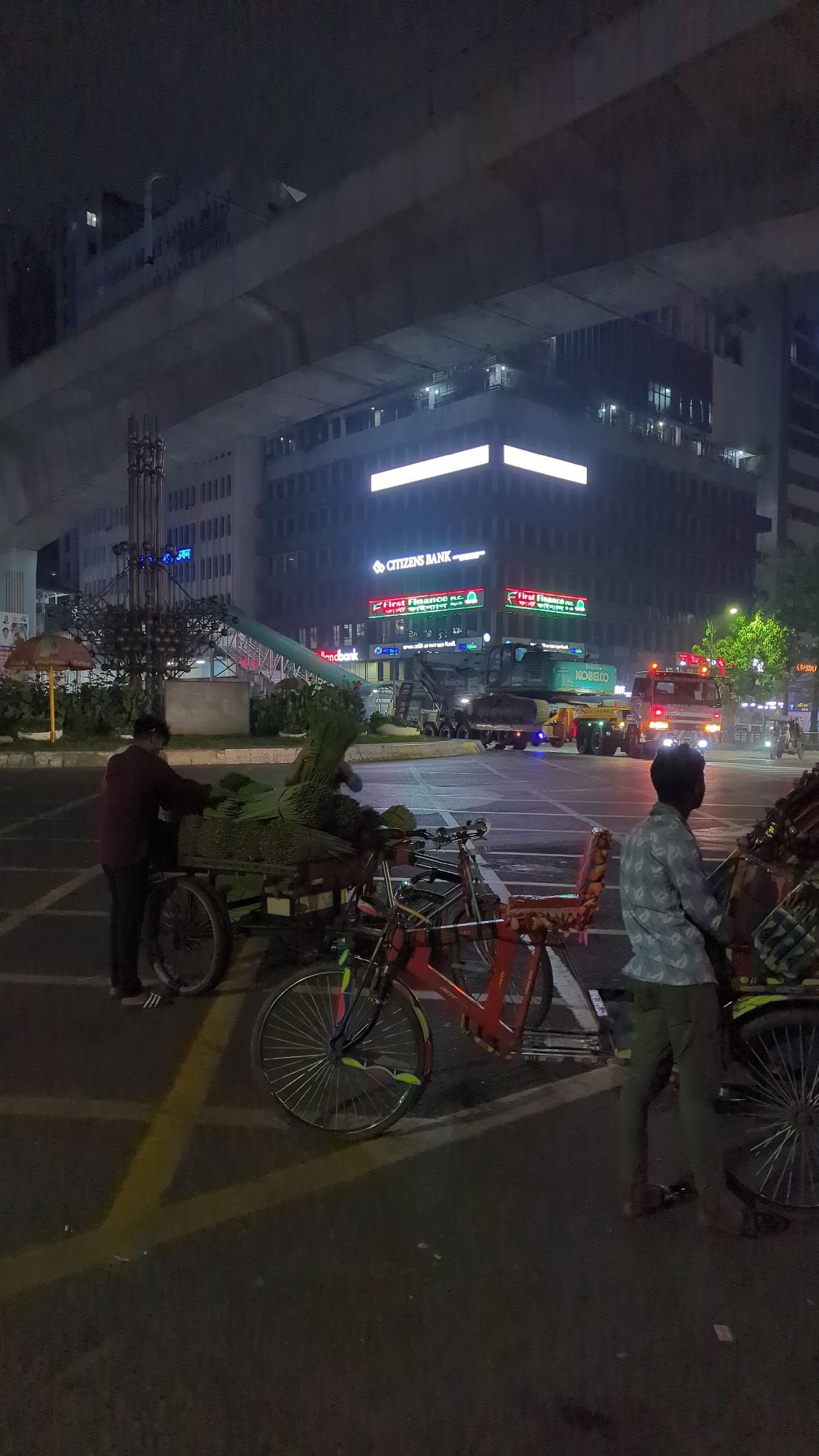 At night in Dhaka, Bangladesh, a street scene is captured with a mix of urban elements. A person is standing near a vendor's cart loaded with greenery, possibly flowers or leaves, while other individu…read more