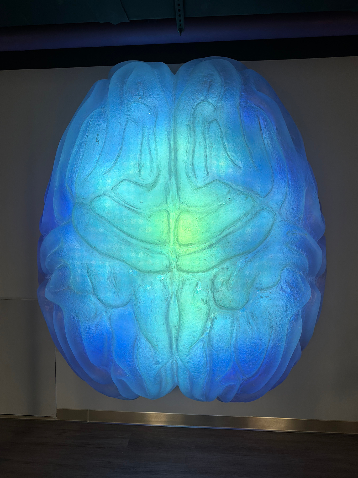 An overhead shot displays a large model of a human brain, constructed from a translucent, textured material that is illuminated from within. The model's surface has intricate contours and ridges, char…read more