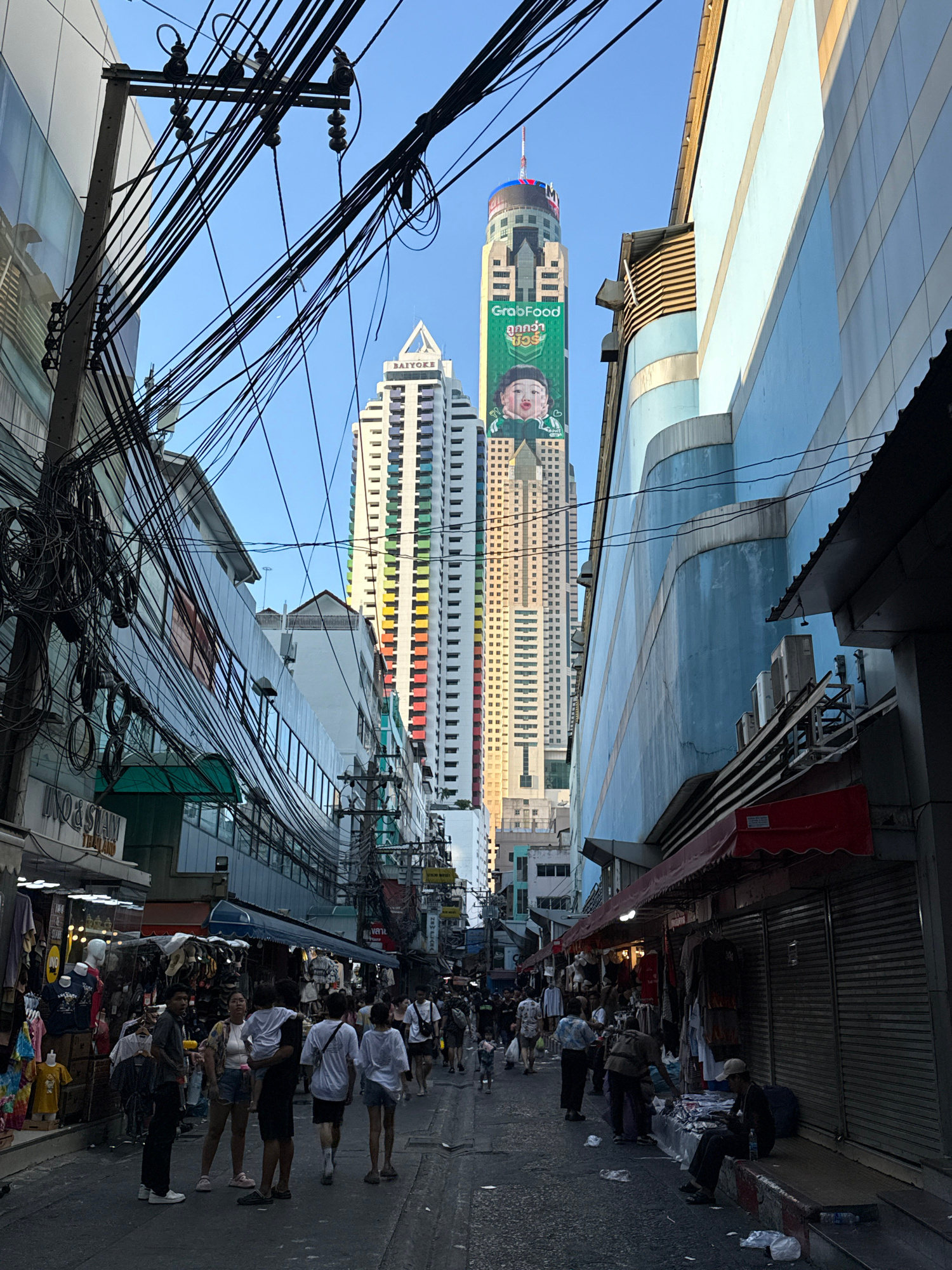 The image depicts a street scene in Bangkok, Thailand. Overhead, a dense network of tangled electrical wires dominates the view. On the right side of the frame, a crowded sidewalk lined with vendors s…read more