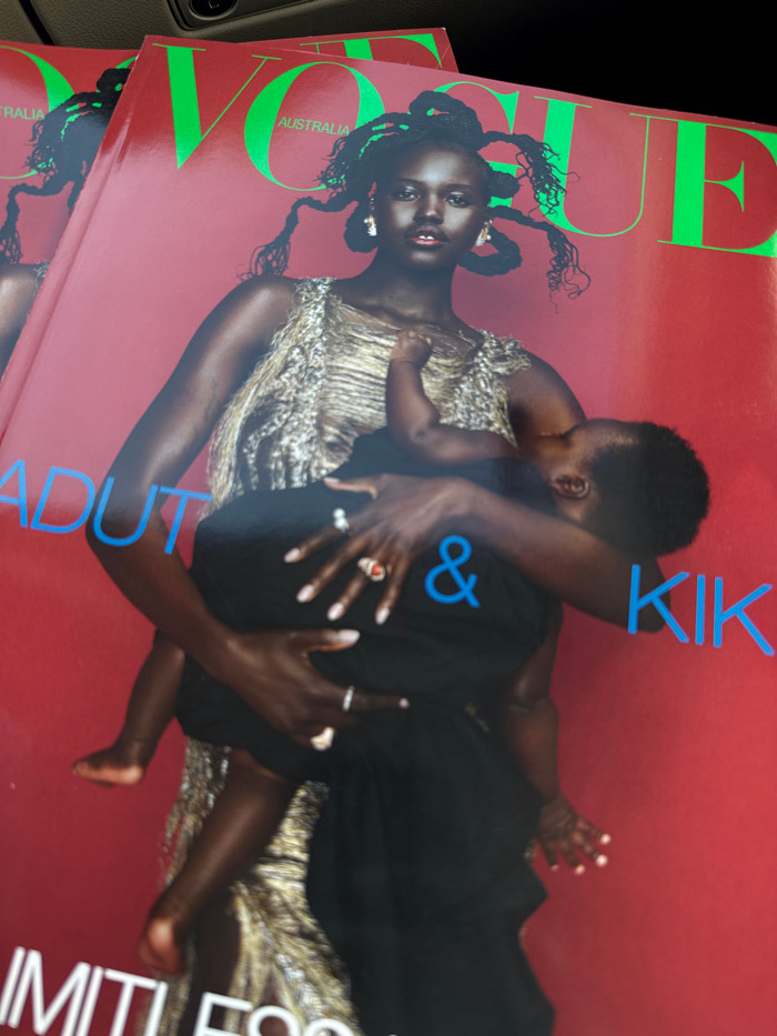 The scene depicts multiple copies of the "VOGUE AUSTRALIA" magazine, positioned against a dark gray, textured vehicle interior roof liner. This event takes place within the city of Los Angeles, United…read more
