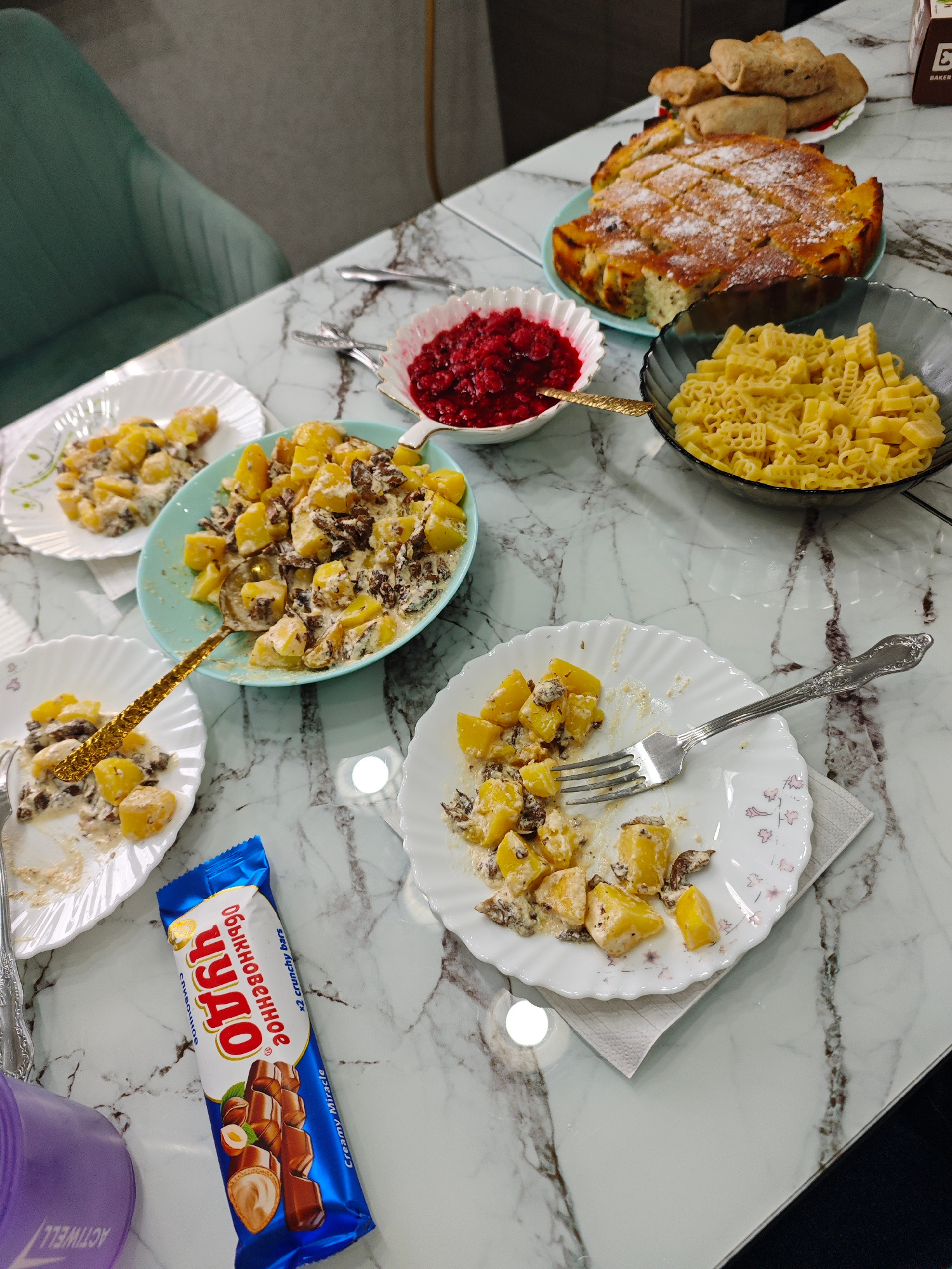 The image captures a casual meal set on a white marble-patterned table. In the foreground, several plates hold what appears to be a creamy potato and mushroom dish. A large light blue serving bowl in…read more
