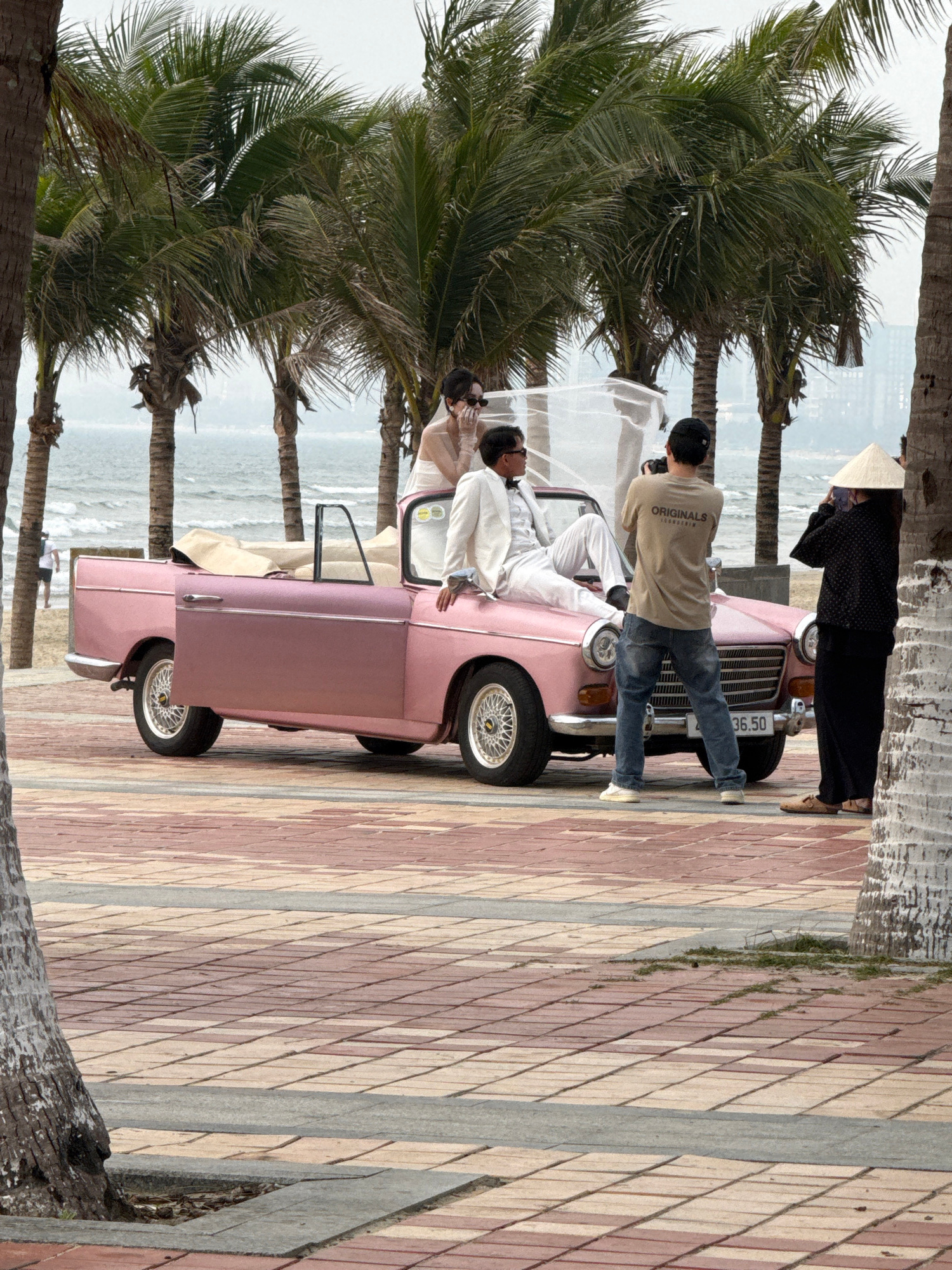 A daytime outdoor scene unfolds on a paved promenade adjacent to a sandy beach in Đà Nẵng, Vietnam. The central focus is a photoshoot featuring a vintage pink two-door convertible car, equipped with s…read more