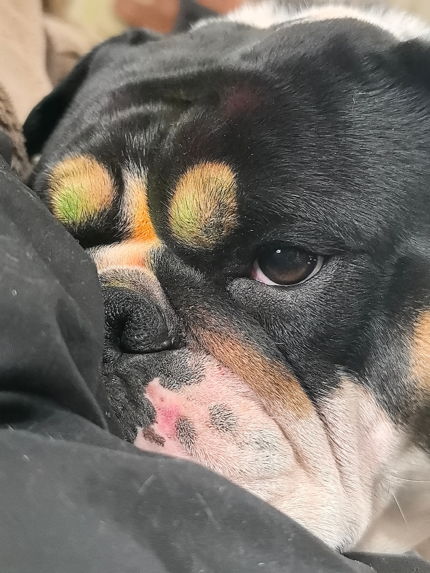 A close-up image shows the face of a bulldog. The dog has black fur on its head and around one eye, with patches of tan and white fur on its snout and around the other eye. The dog's nose is black, an…read more