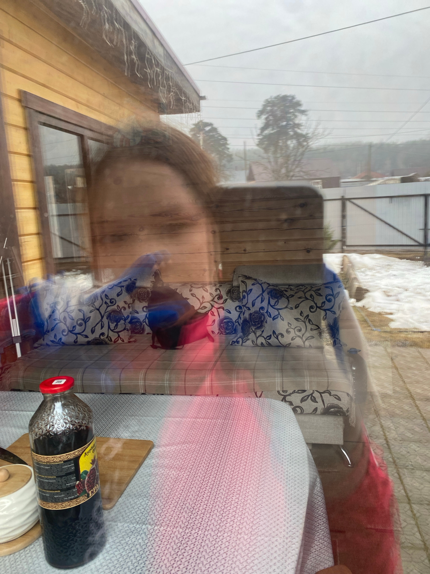 The image appears to be a reflection in a window. The reflection shows a person with brown hair, a building with wooden siding, a snowy outdoor scene, and interior elements. Inside, there's a couch wi…read more