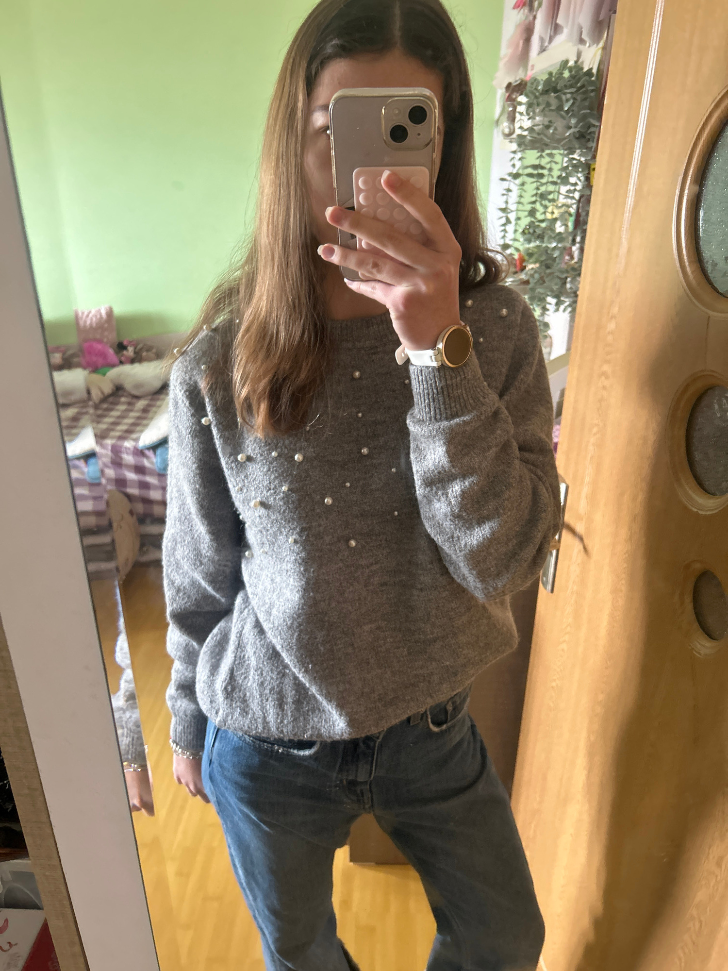 The image is a selfie taken in a mirror. A person with long brown hair is holding a smartphone in their left hand, obscuring their face, to take the picture. They are wearing a grey sweater adorned wi…read more