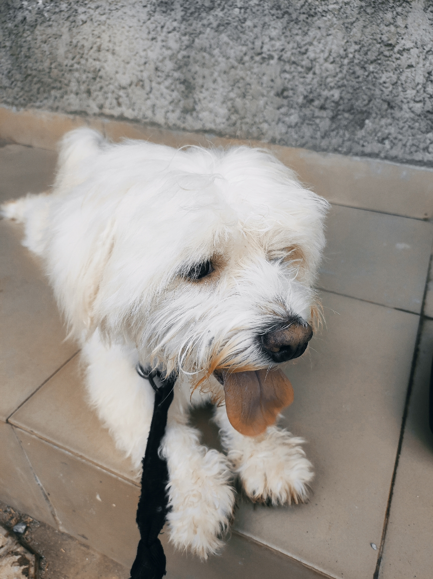 A fluffy, white, medium-sized dog with a black leash is lying on a tiled surface. The dog has its tongue hanging out, suggesting it might be panting or hot. The background includes a wall with a mottl…read more