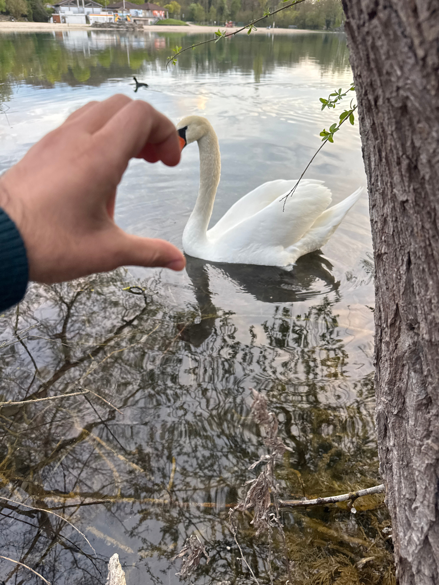 A daytime eye-level photograph shows a white swan in the water with a person's hand giving a thumbs-up in the foreground. The photograph appears to have been taken on the shore of a body of water in I…read more