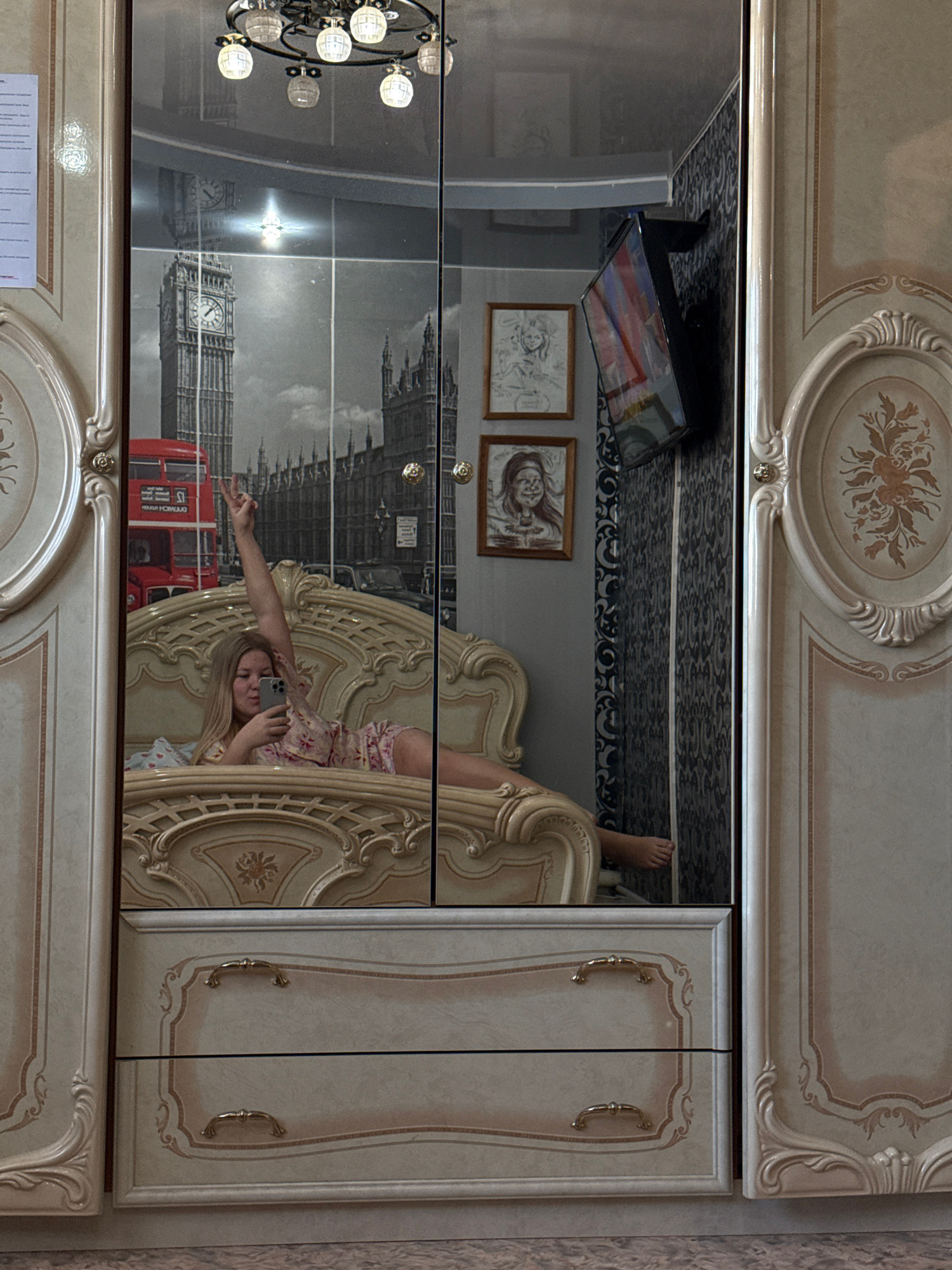 The image shows a reflection in a mirrored wardrobe, likely located indoors, in an unspecified location in the city of Chaikovsky, Russia. The reflection depicts a room with a bed and a person taking…read more