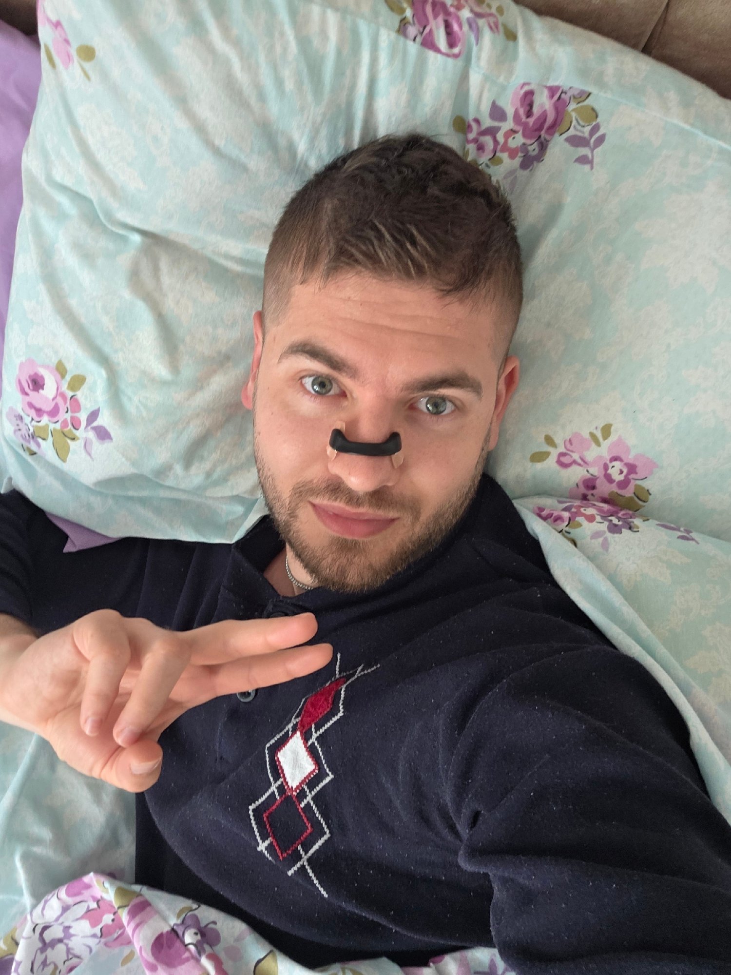 A man lies on a floral-patterned pillow and bedding. He wears a dark blue sweater with diamond-shaped patterns on the upper left. He holds up his left hand in a gesture. A black nasal dilator is place…read more