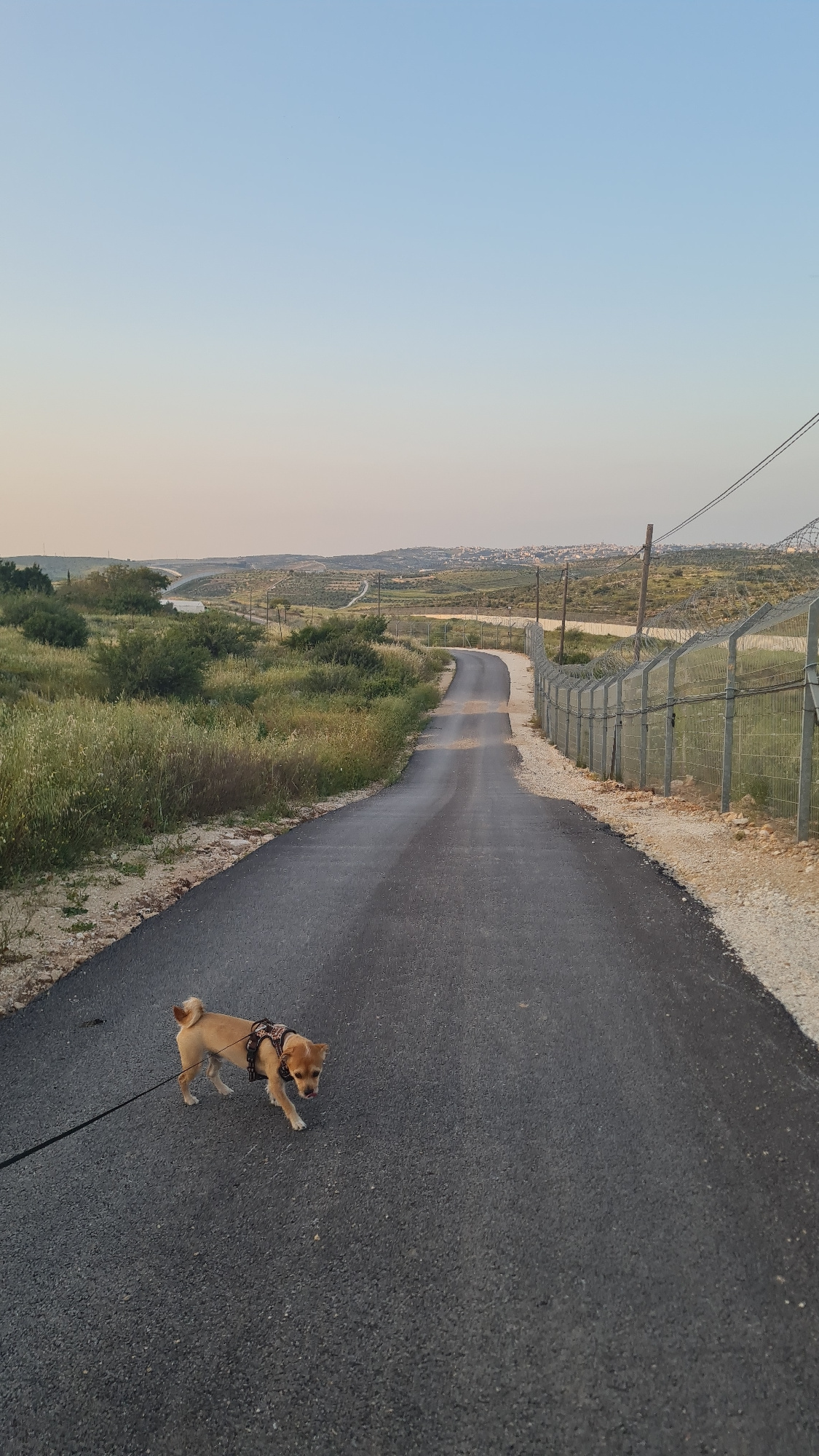 A tanned dog is walking on a paved road in the Lachish Regional Council, Israel. A metal fence runs along the left side of the road, with a grassy slope below it. In the background, there are building…read more