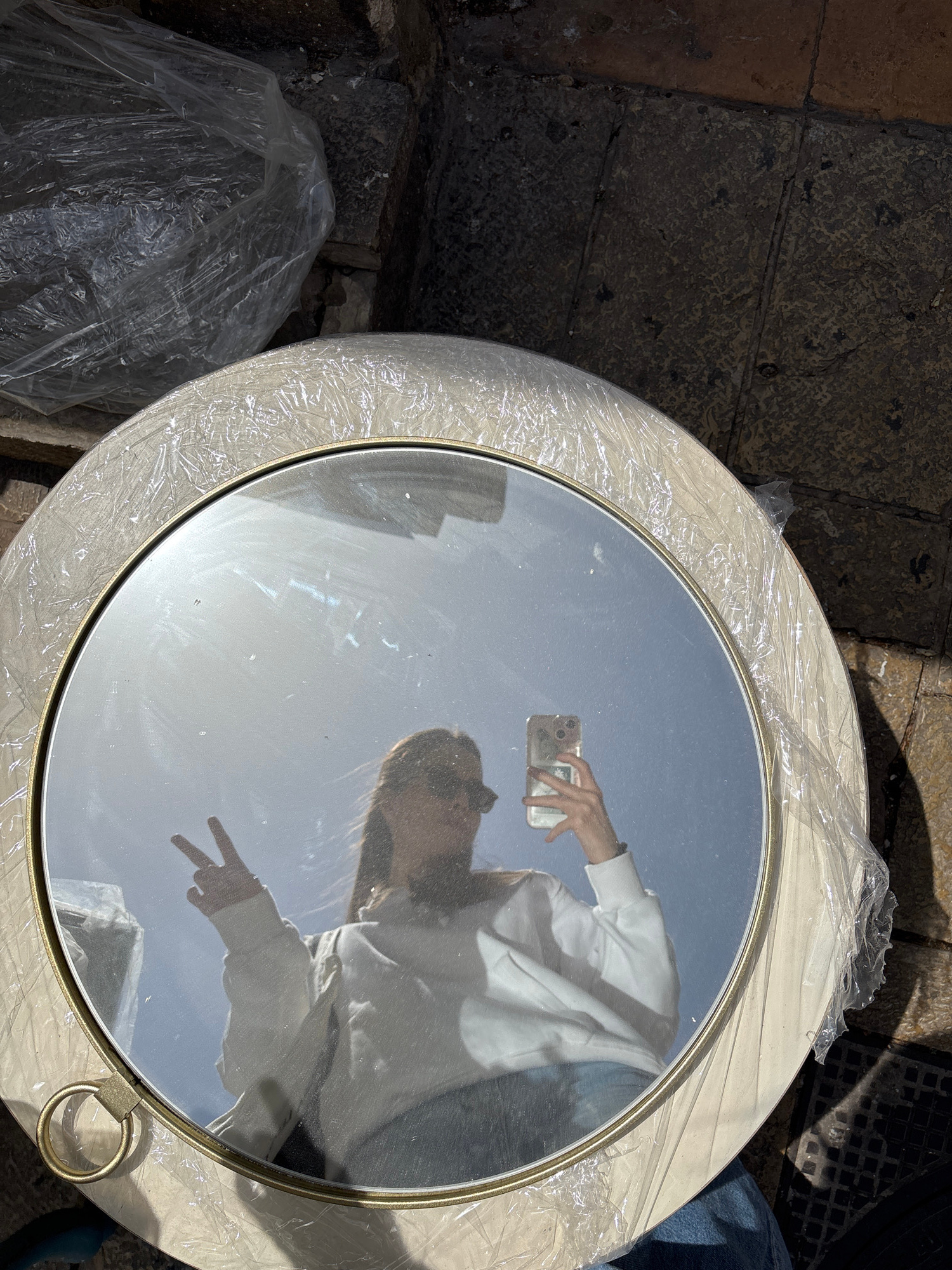 The image is a close-up, overhead shot of a round mirror with a light-colored frame, likely cream or off-white, and a thin gold accent line. The mirror is partially covered in clear plastic wrap. Refl…read more