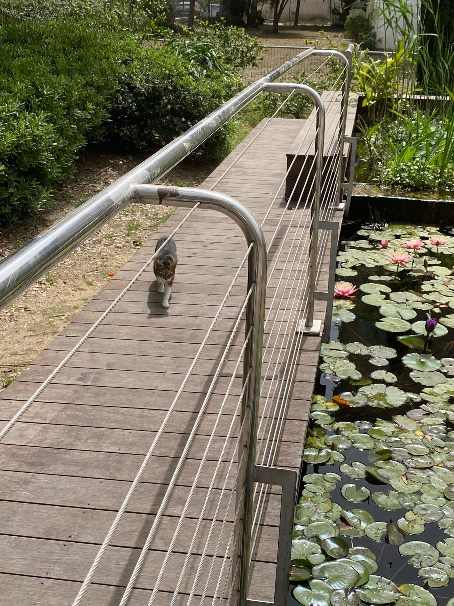 A medium shot shows a gray, white, and brown cat lying on a wooden boardwalk in Kiryat Bialik, Israel. The boardwalk is bordered by a stainless steel railing composed of horizontal cables. To the left…read more
