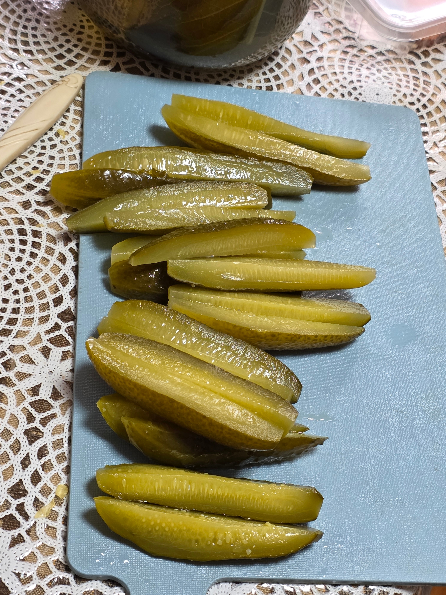 This close-up image, captured in Chaikovsky, Russia, displays numerous sliced dill pickles arranged on a light blue cutting board. The pickles, cut lengthwise into spears or quarters, exhibit a glossy…read more