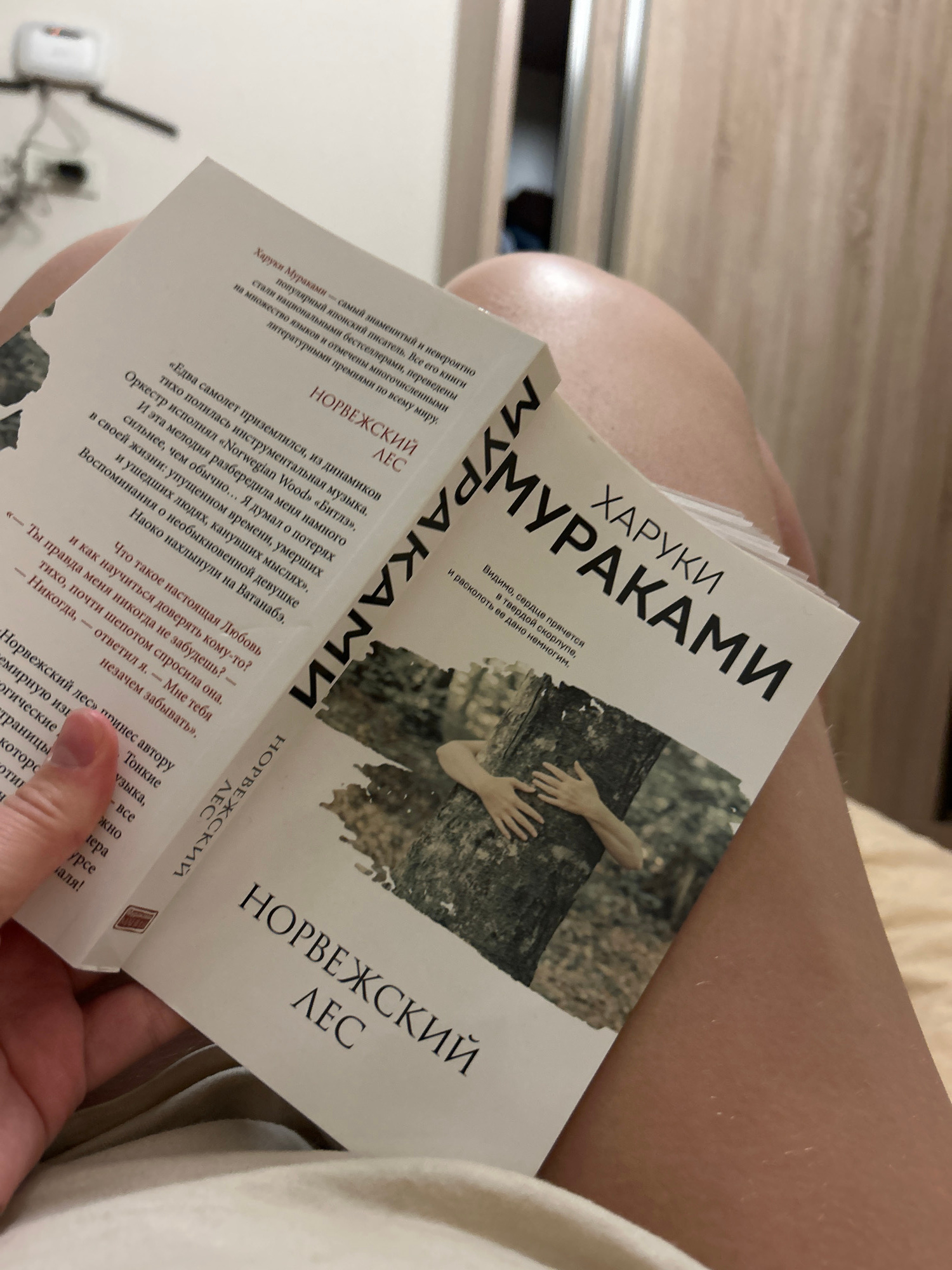 A person is holding two copies of the book "Norwegian Wood" (Норвежский Лес) by Haruki Murakami. The books are open, showing the cover and inside pages. The cover of the book has an image of two hands…read more