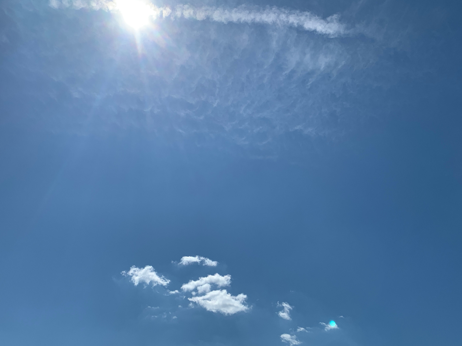 The image shows a bright blue sky with the sun in the upper left corner, with sun rays visible. A thin, white cloud stretches across the upper right quadrant. A cluster of small, fluffy white clouds a…read more