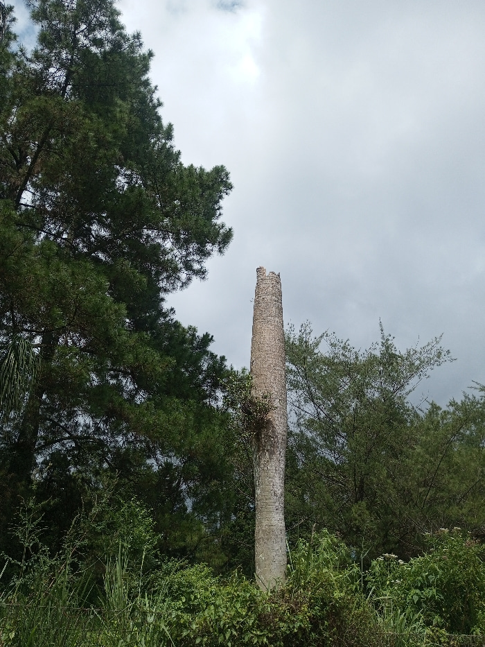 A tall, grey, dead tree trunk stands prominently amidst lush greenery. The top of the trunk is broken and uneven. To the left, a dense, green coniferous tree towers, while other trees and shrubs fill…read more