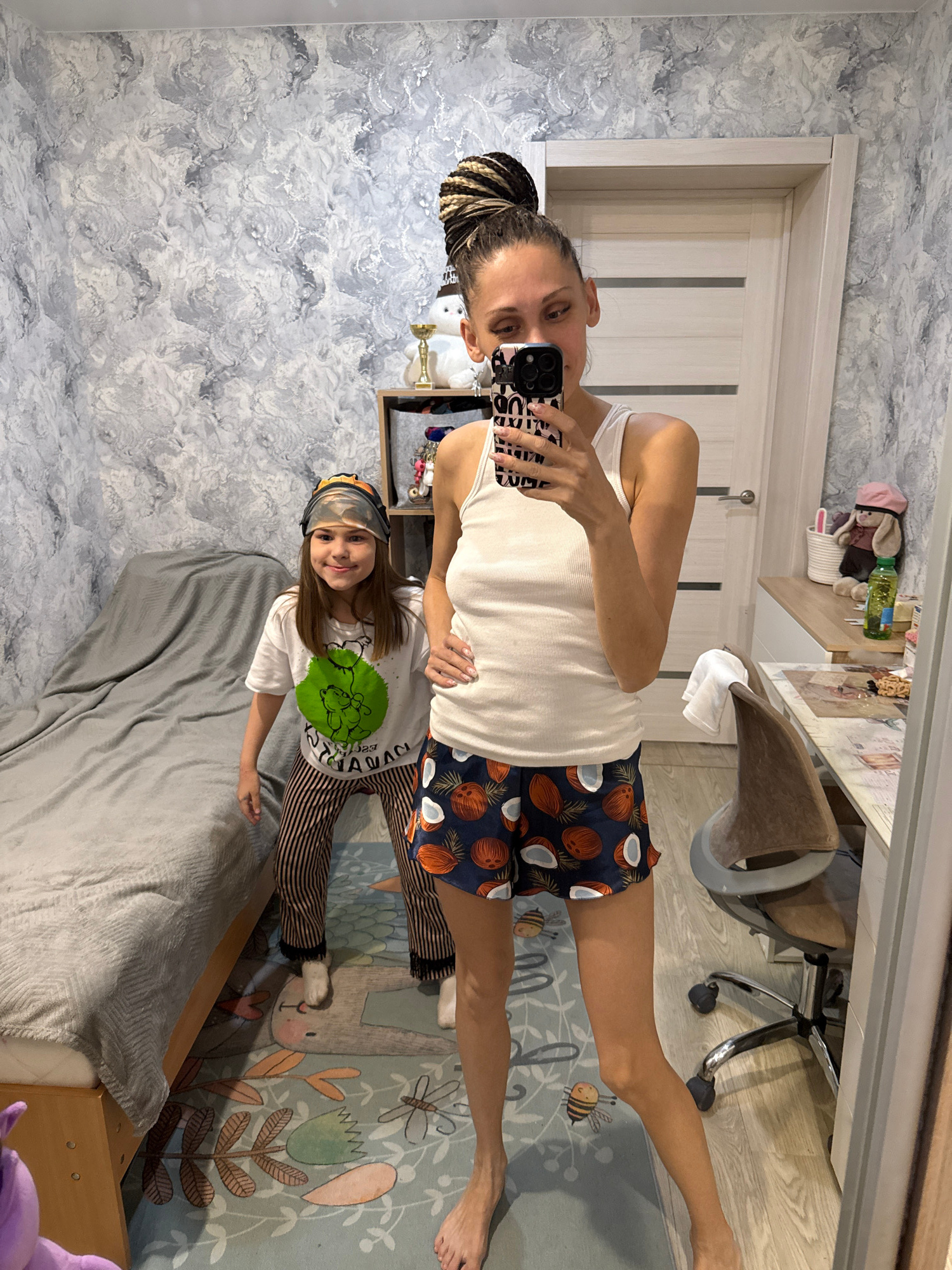 An indoor mirror selfie captures an adult woman and a young girl, both appearing happy and relaxed, in what seems to be a bedroom in Rusanovo, Russia. The adult woman, positioned closer to the mirrorβ¦read more