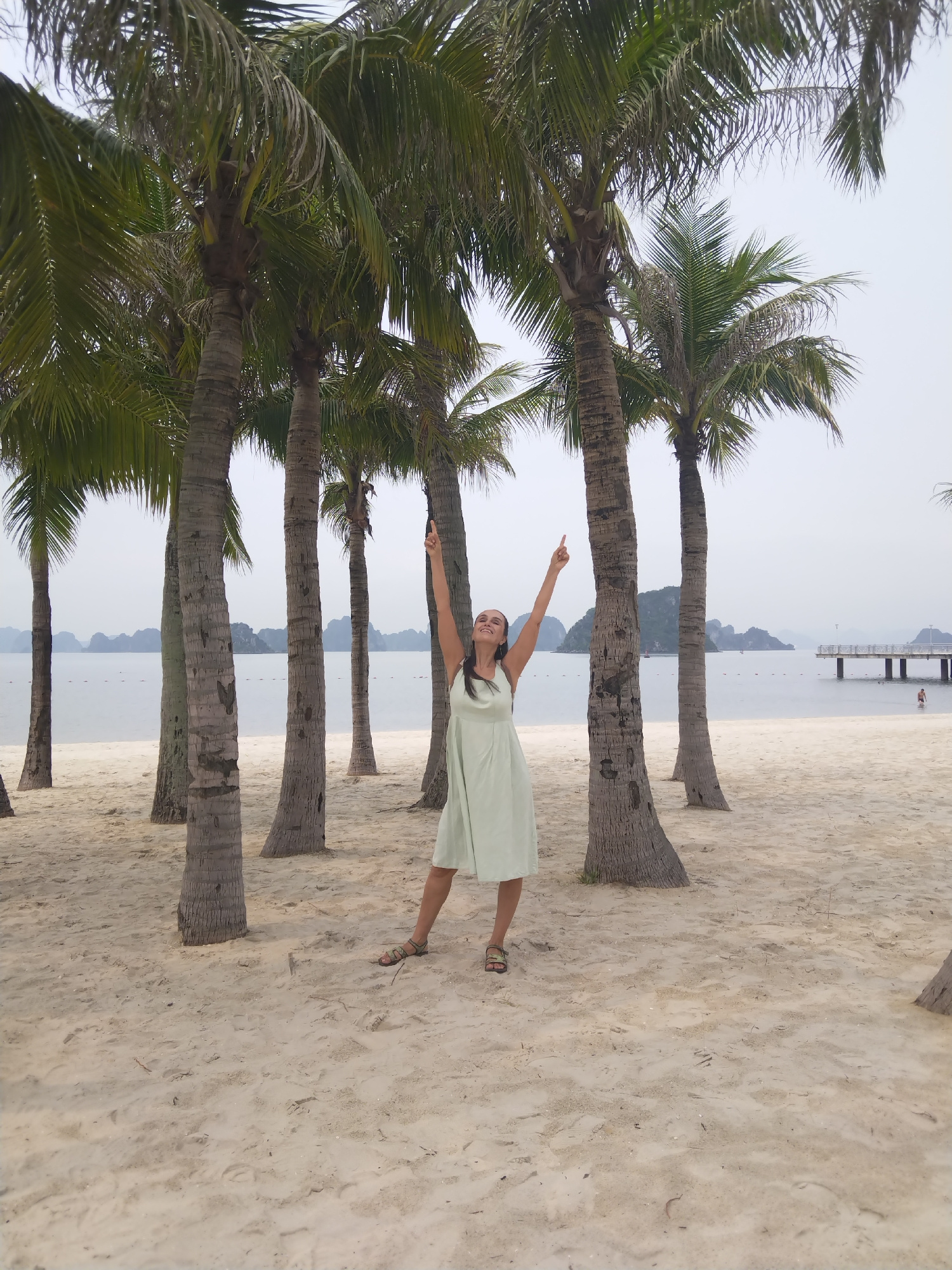 A vibrant outdoor photograph captures a woman standing joyfully on a sandy beach amidst a cluster of tall palm trees in Ha Long Ward, Vietnam. The woman, positioned centrally, wears a light-colored, s…read more