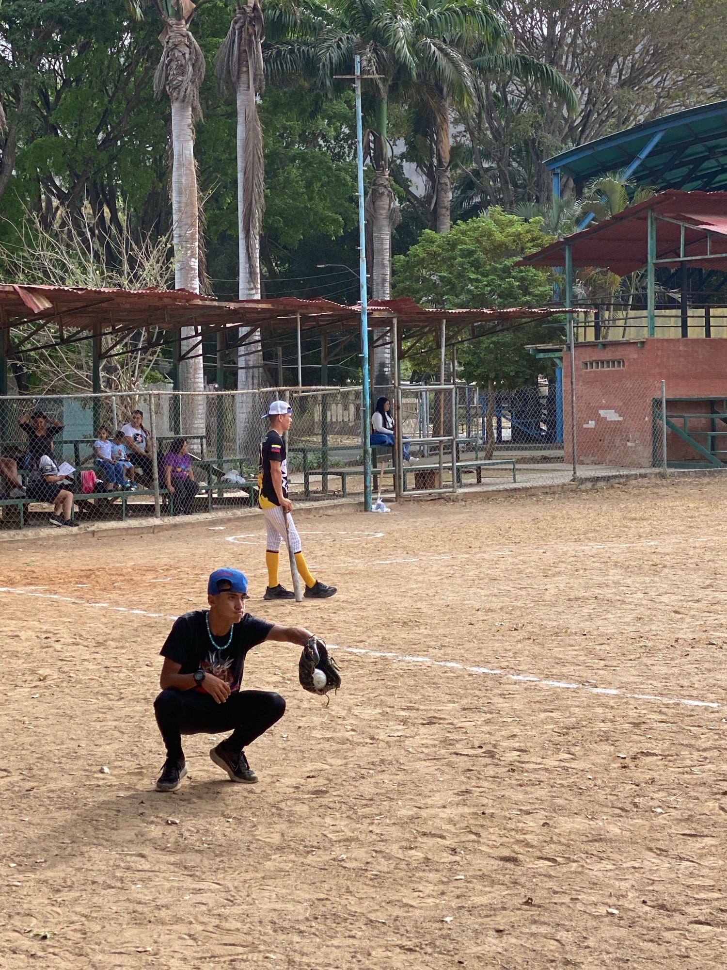 A youth baseball game is in progress. A young male in black pants and a black t-shirt with a blue baseball cap is crouching on the infield dirt, catching a baseball in his mitt. Another youth in baseb…read more