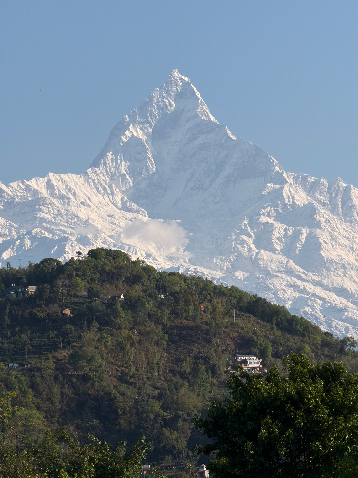 The image shows a view in Pokhara, Nepal. A snow-covered mountain, likely part of the Annapurna range, dominates the left side of the frame. The sky is a clear, pale blue. On the right side, a steep,…read more