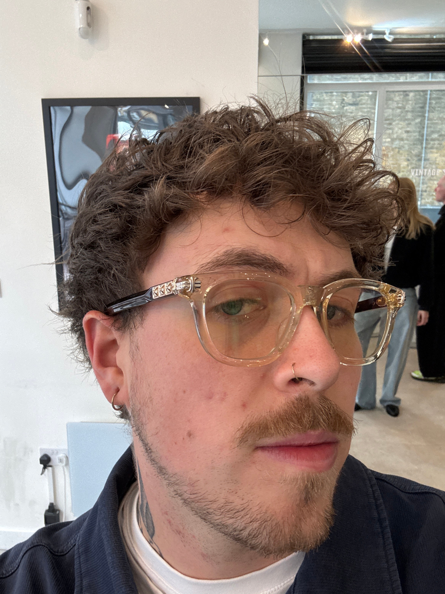 A close-up portrait captures a young adult male with curly, light brown hair and a light brown beard and mustache, looking directly towards the viewer. He wears clear, light amber-tinted eyeglasses wi…read more
