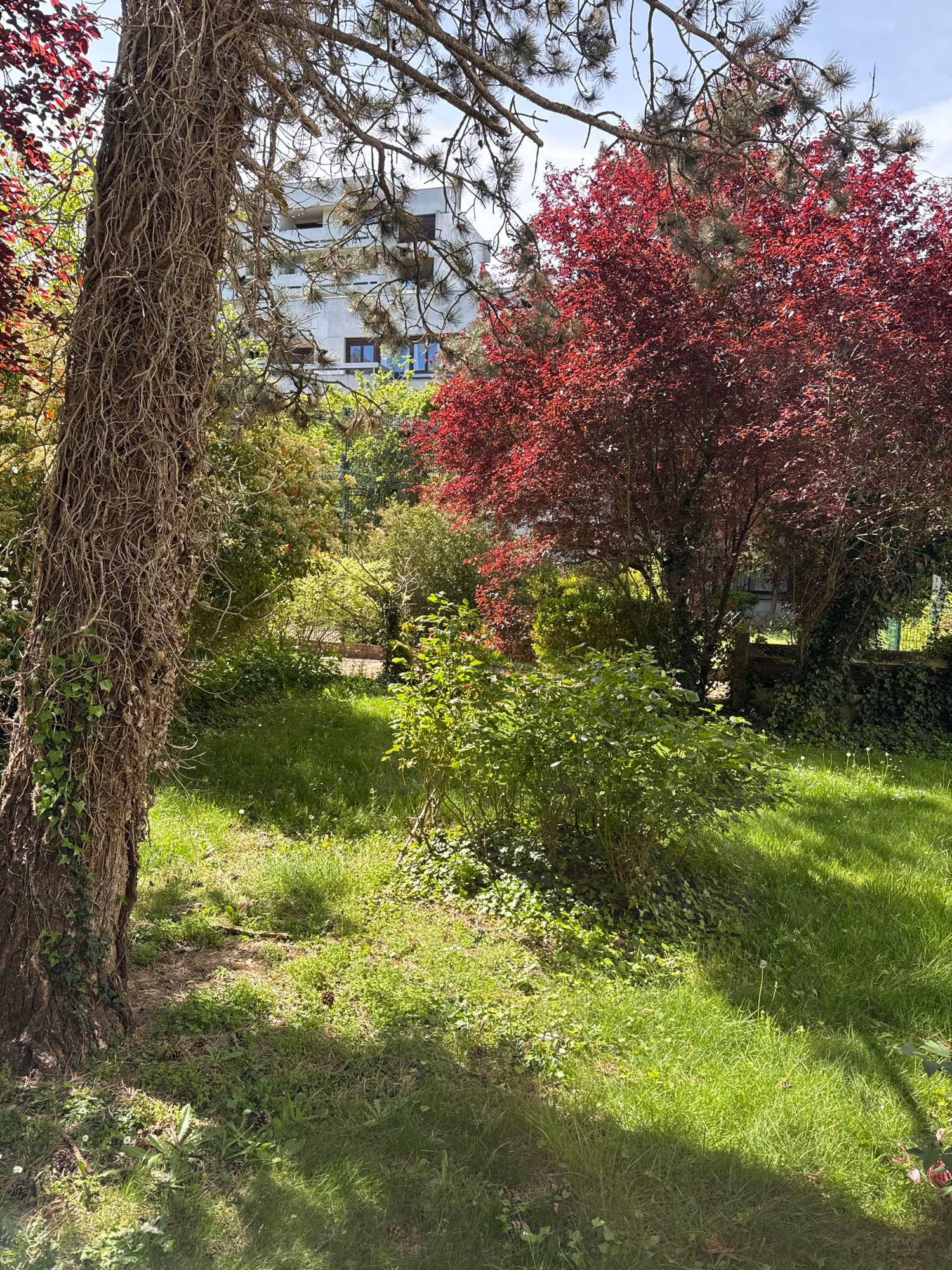 This is an outdoor scene in Les Ulis, France, capturing a lush, green area with diverse vegetation. In the foreground is a large tree trunk covered with vines, obscuring part of the view. Behind it, t…read more