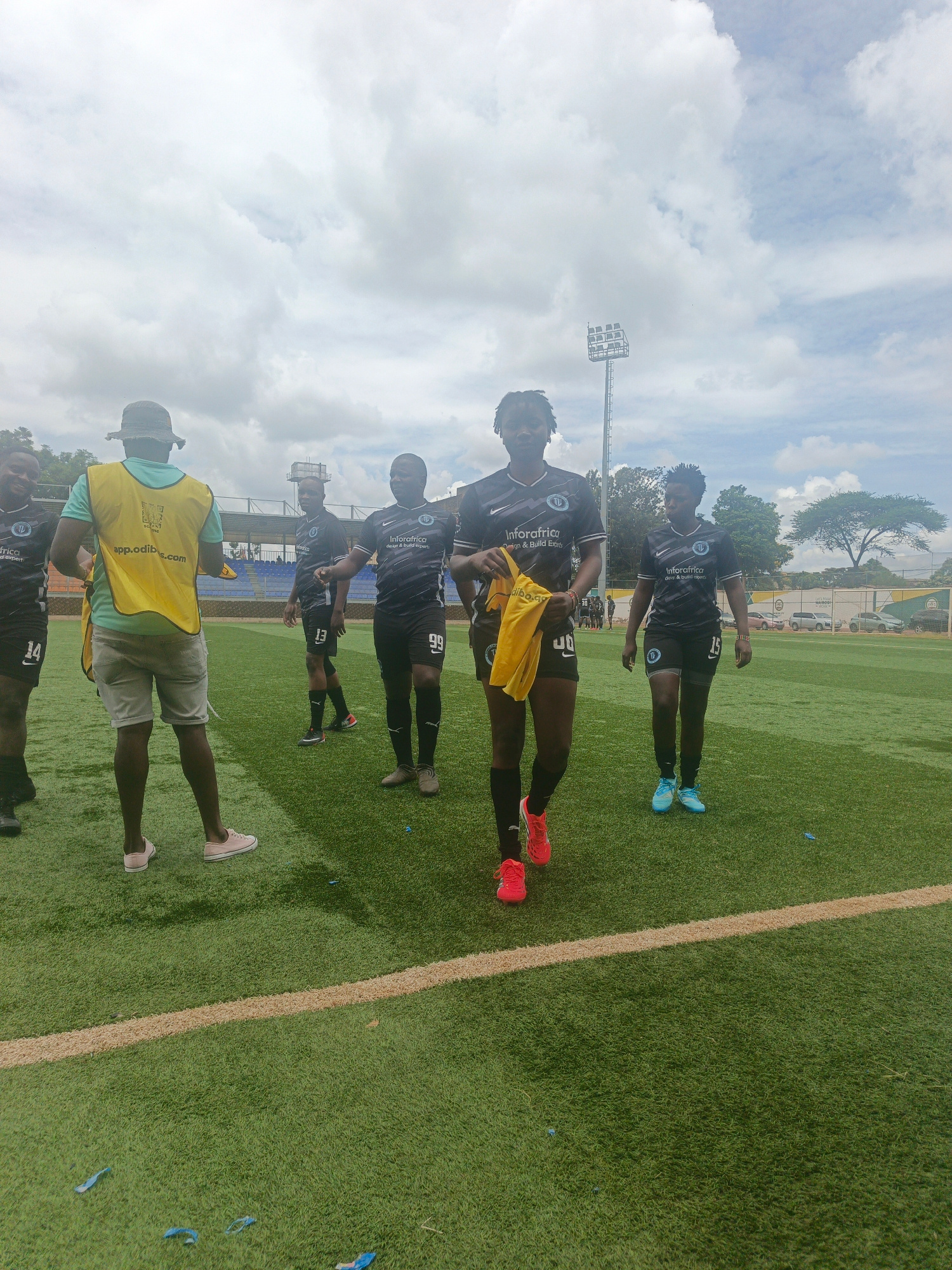 The image shows a group of soccer players walking on a green soccer field, possibly at a stadium or sports complex in Nairobi, Kenya. The players are wearing matching black and grey uniforms with the…read more