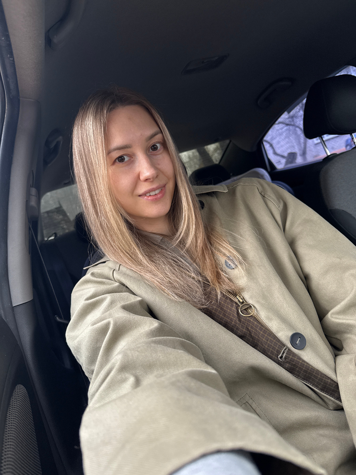 A woman with blonde hair is sitting in a car. She is wearing a light beige jacket with a brown patterned lining visible near the zipper. The car's interior is dark. Outside, there is a glimpse of a st…read more