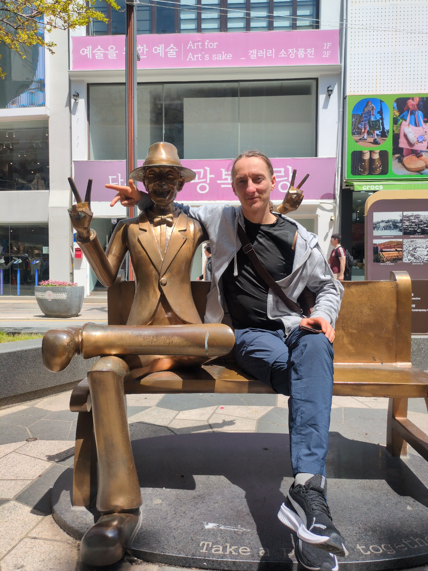 A man in a gray sweatshirt and black t-shirt is posing for a picture with a bronze statue of a man wearing a suit and hat on a street in Busan, South Korea. Both the man and the statue are holding up…read more