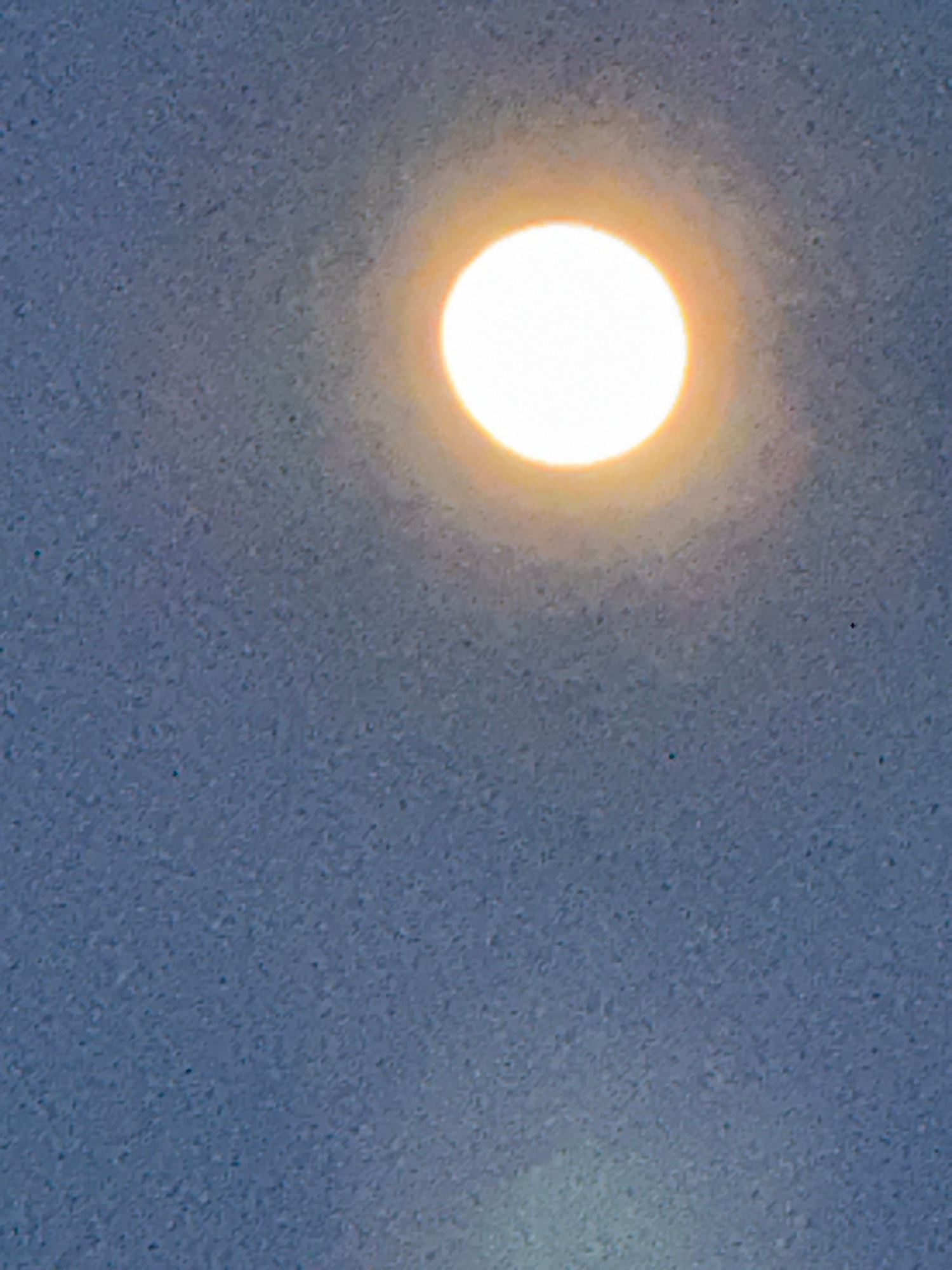 The image shows a bright, circular light source, possibly the sun or a street lamp, on the left side of the frame. The background appears to be a textured, light-blue surface. The location in the city…read more