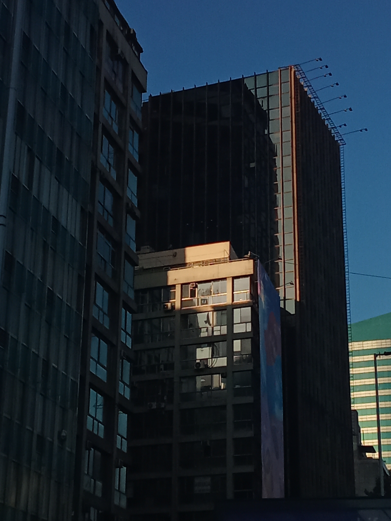 The image shows a view of several buildings in the city of Santiago, Chile. The buildings are tall and constructed with many windows. The building in the middle is shorter than the others, and it has…read more