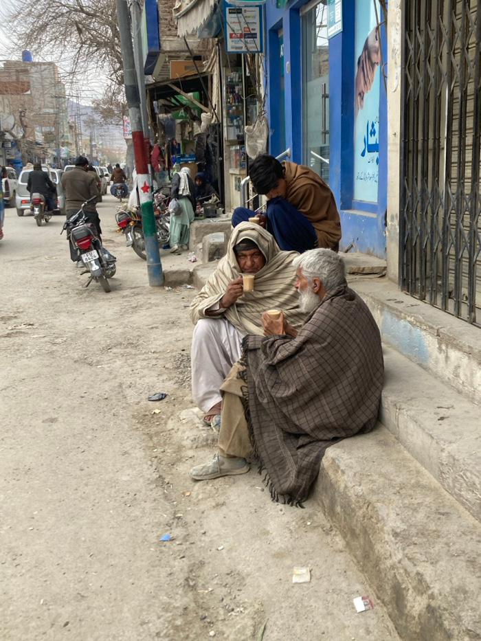 The image depicts a street scene in Loralai, Pakistan, characterized by a busy commercial environment under an overcast sky. In the foreground, two elderly men are seated on the ground and a concrete…read more