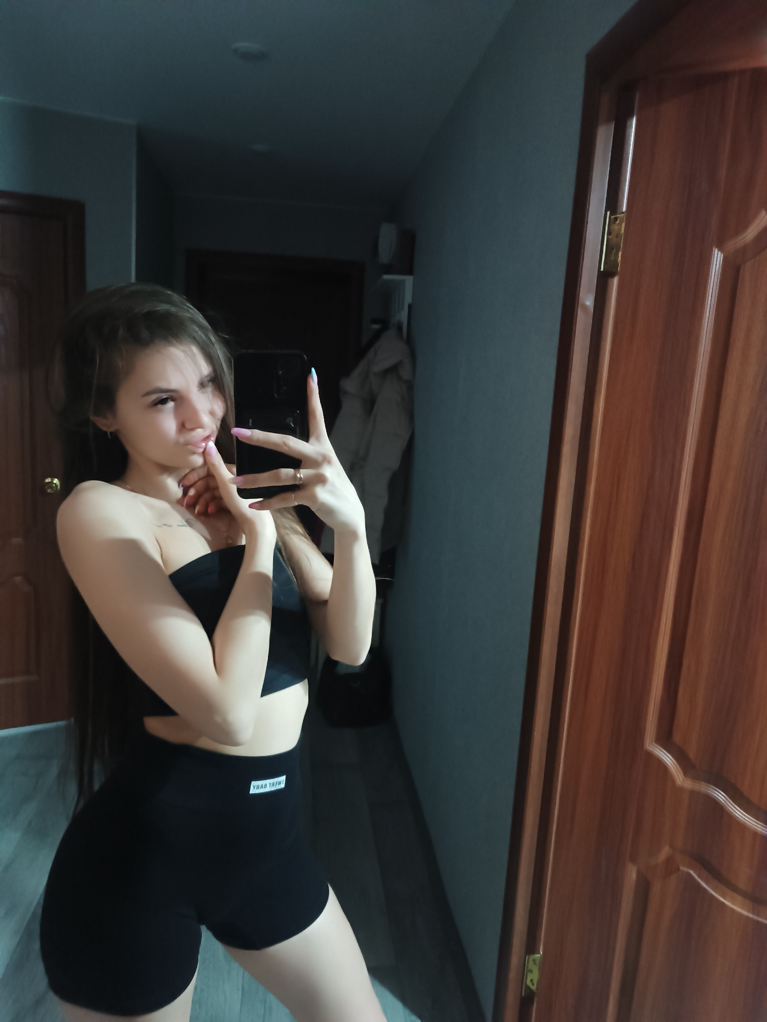 A young woman is taking a selfie in an indoor setting, likely a hallway. She is wearing a black strapless top and black shorts. The background includes a hallway with doors and a coat hanging. It is p…read more