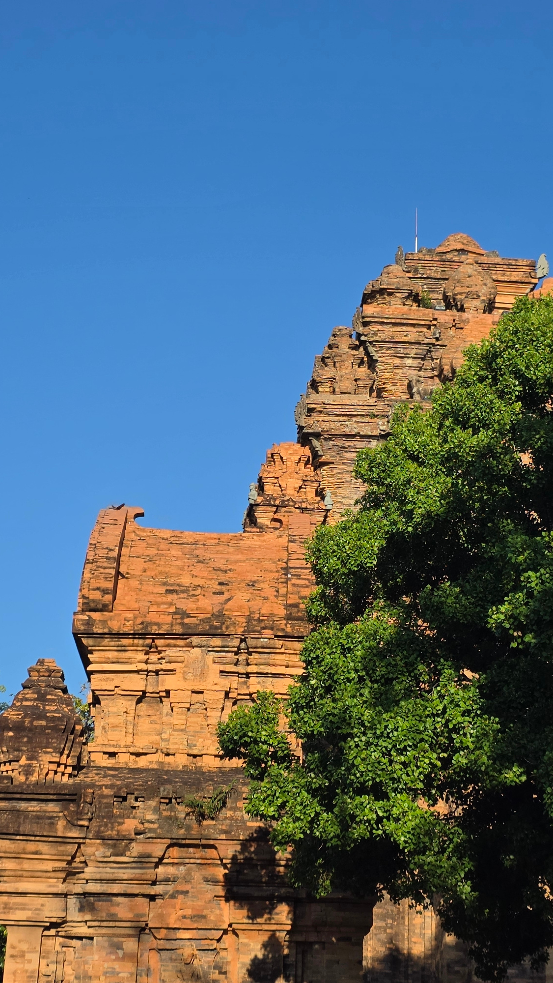 The image depicts the Po Nagar Cham Towers, a temple complex in Nha Trang, Vietnam. The structures are made of reddish-brown brick and stone, with some sections covered in green vegetation. The backgr…read more
