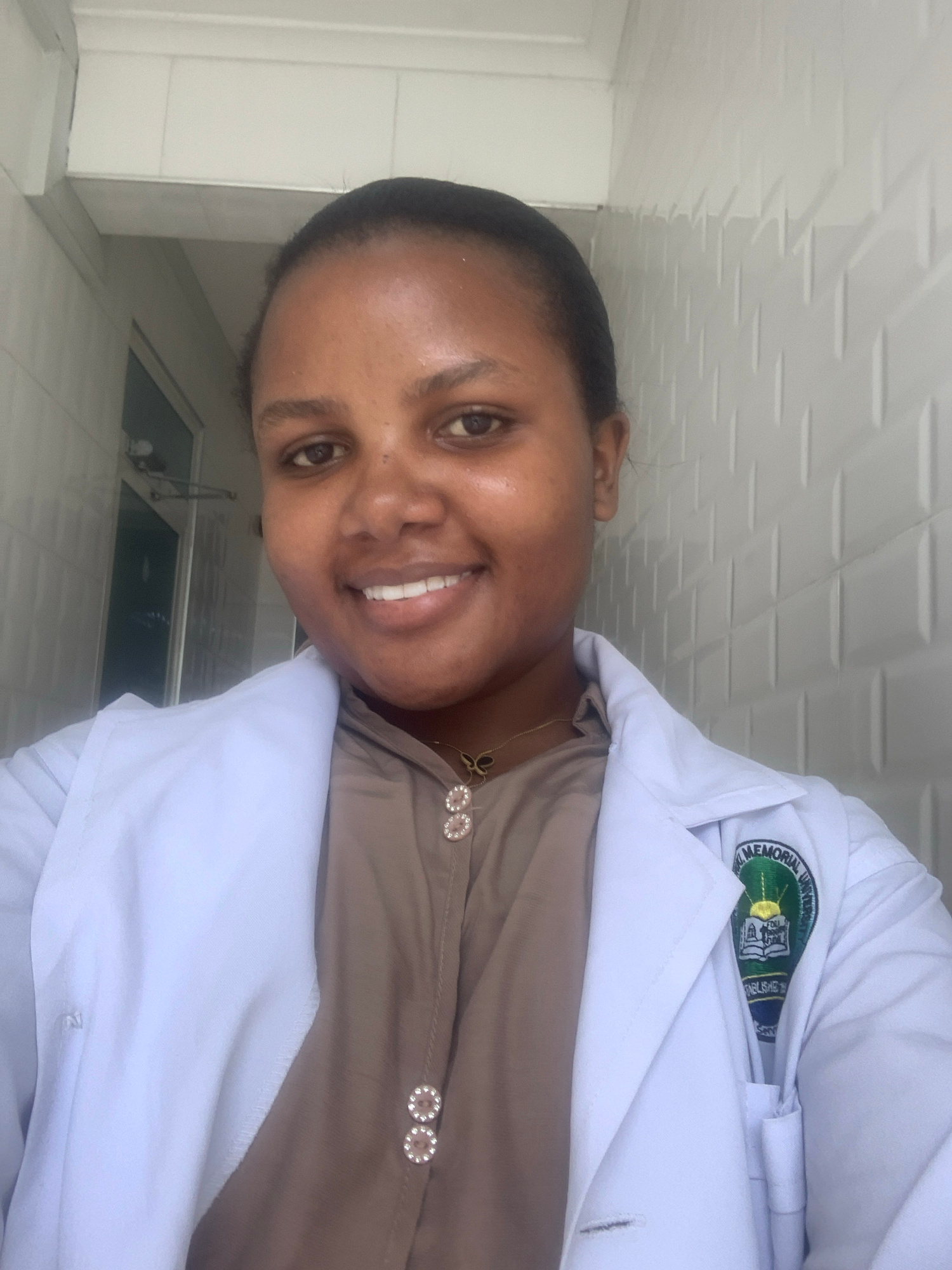 The image displays a head-and-shoulders portrait of an adult female located in what appears to be a brightly lit indoor or semi-indoor corridor at Kairuki Memorial University in Dar es-Salaam, Tanzania. The subject has dark skin, dark hair pulled back, and is smiling directly at the camera, revealing white teeth. She is wearing a white lab coat, which has the emblem of "Kairuki Memorial University" visible on the right lapel. Underneath the lab coat, she wears a light brown or taupe collared shirt with multiple circular, decorative buttons. A gold-colored necklace with a butterfly-shaped pendant is visible around her neck. The background on the left shows a white paneled ceiling structure and a light-colored wall, with a partial view of an entryway or window in the distance. The background on the right features a white wall with a repeating raised rectangular pattern, suggesting textured tiles or panels. | Open Wire