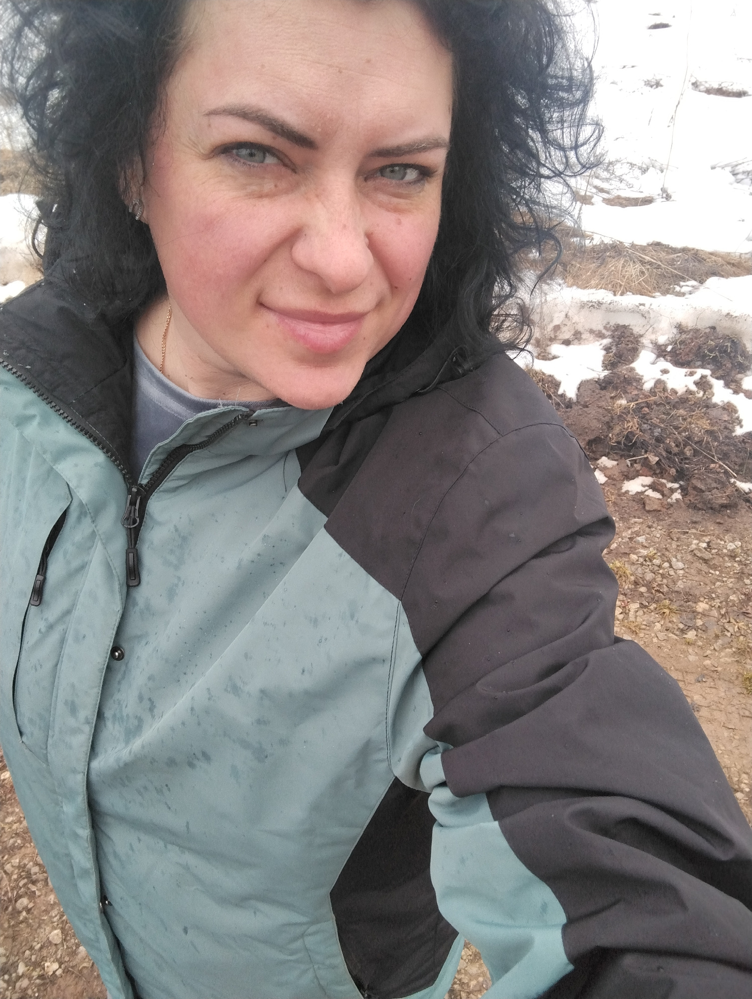The photograph shows a woman wearing a blue-green and black jacket standing outdoors. Her dark, curly hair frames her face, and she has light-colored eyes. The jacket appears to be wet with visible wa…read more
