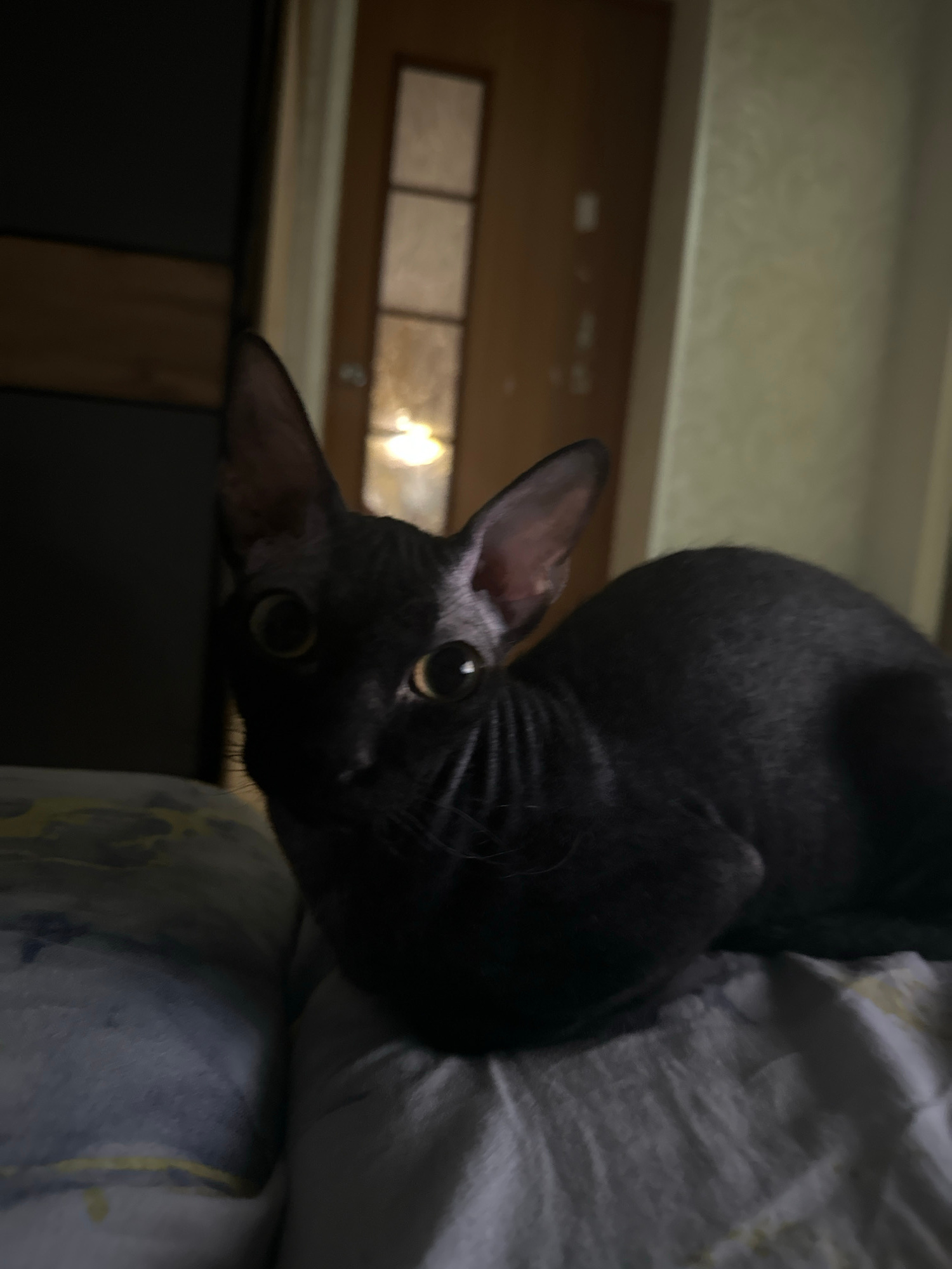 A close-up, low-angle shot depicts a dark-colored, possibly black, cat perched on what appears to be a bed or other soft surface covered with a light-colored fabric with a mottled pattern. The cat's h…read more