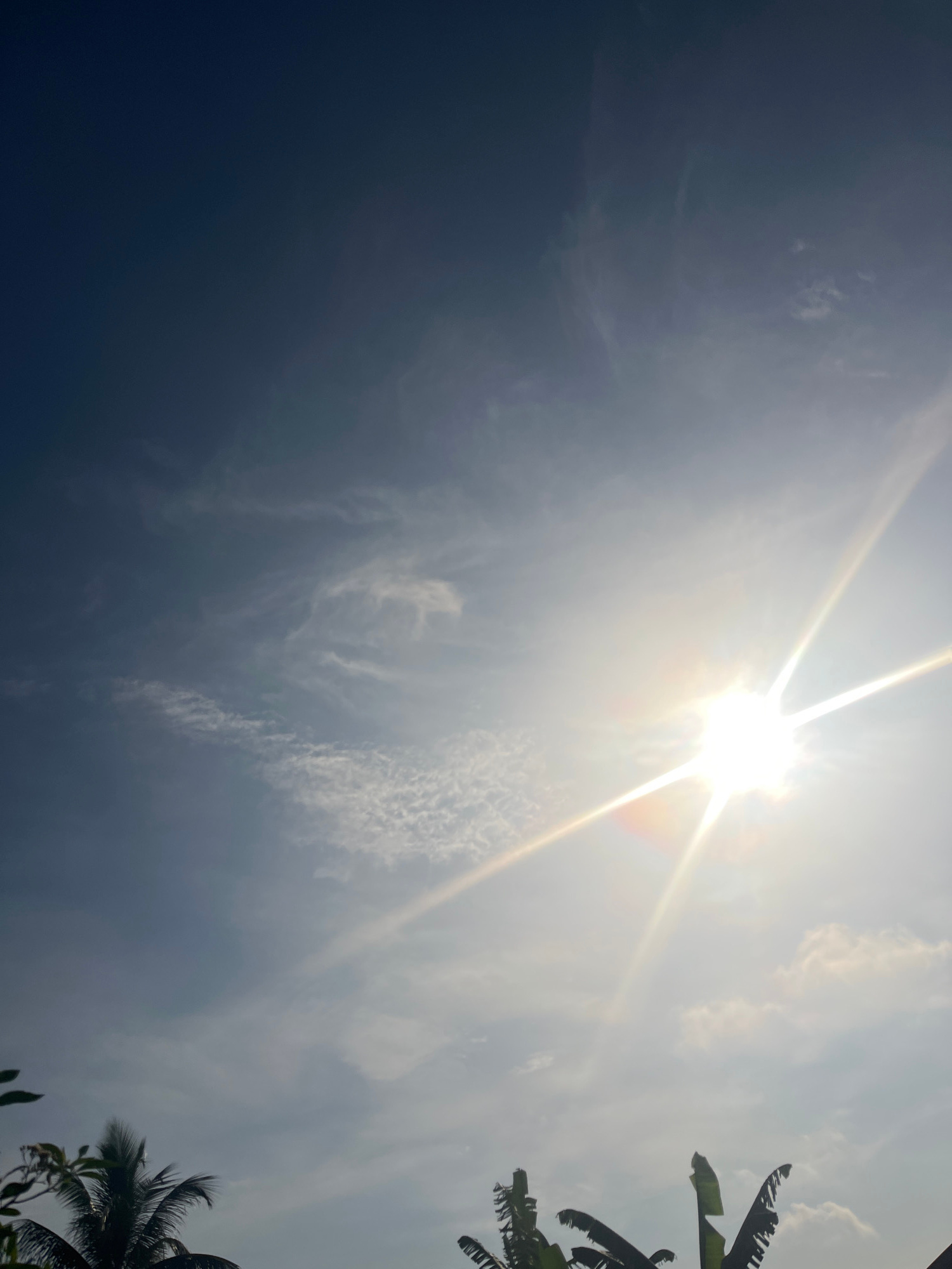 The image shows a view of the sky with the sun shining brightly, creating a strong glare and starburst effect. There are also wispy clouds scattered across the sky. In the lower right corner, there arβ¦read more