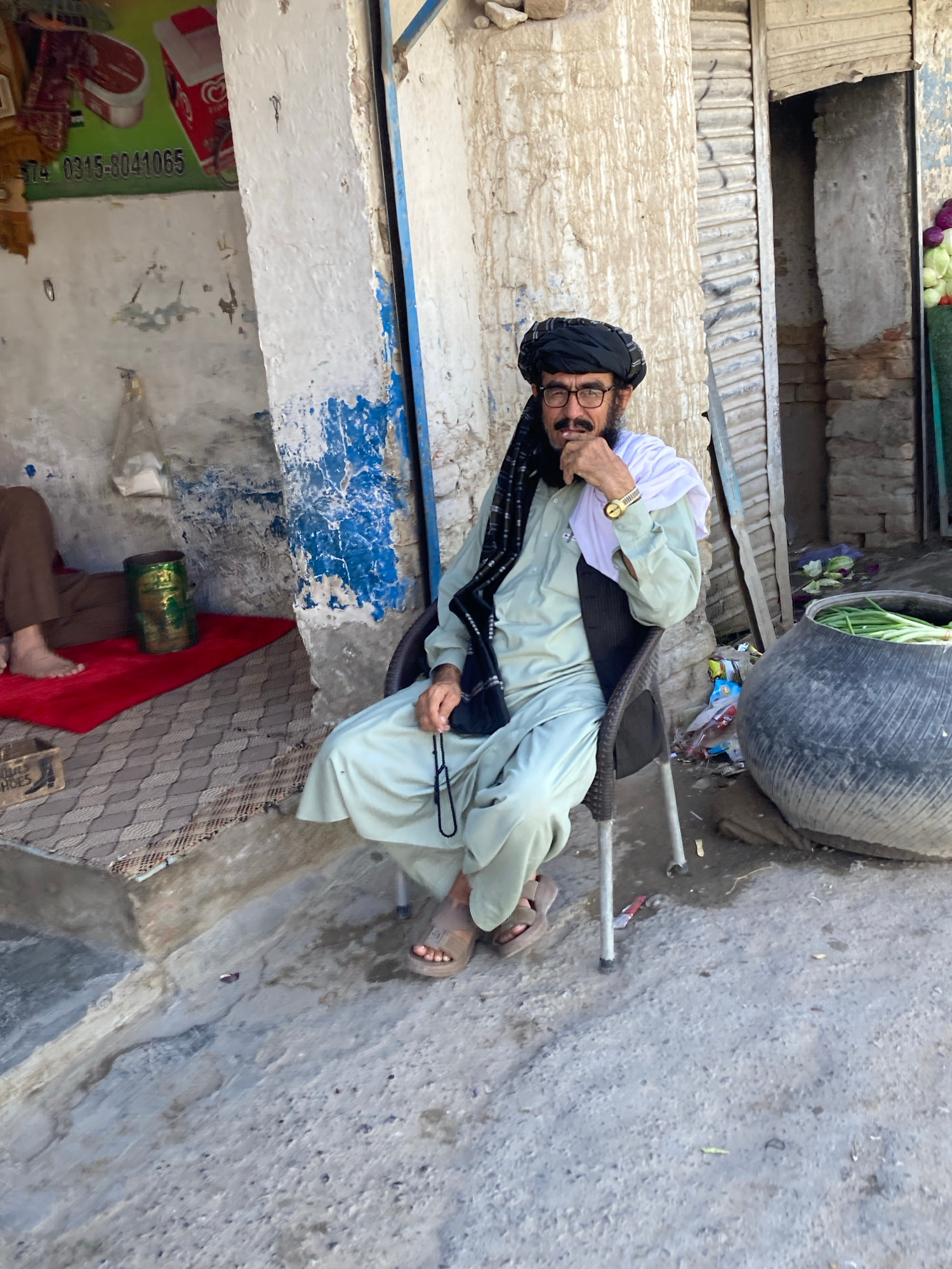 An elderly man sits on a plastic chair in an alley in Quetta City Tehsil, Pakistan. He wears a black turban, glasses, a white shawl, and a light green shalwar kameez with a black vest. He holds a blac…read more