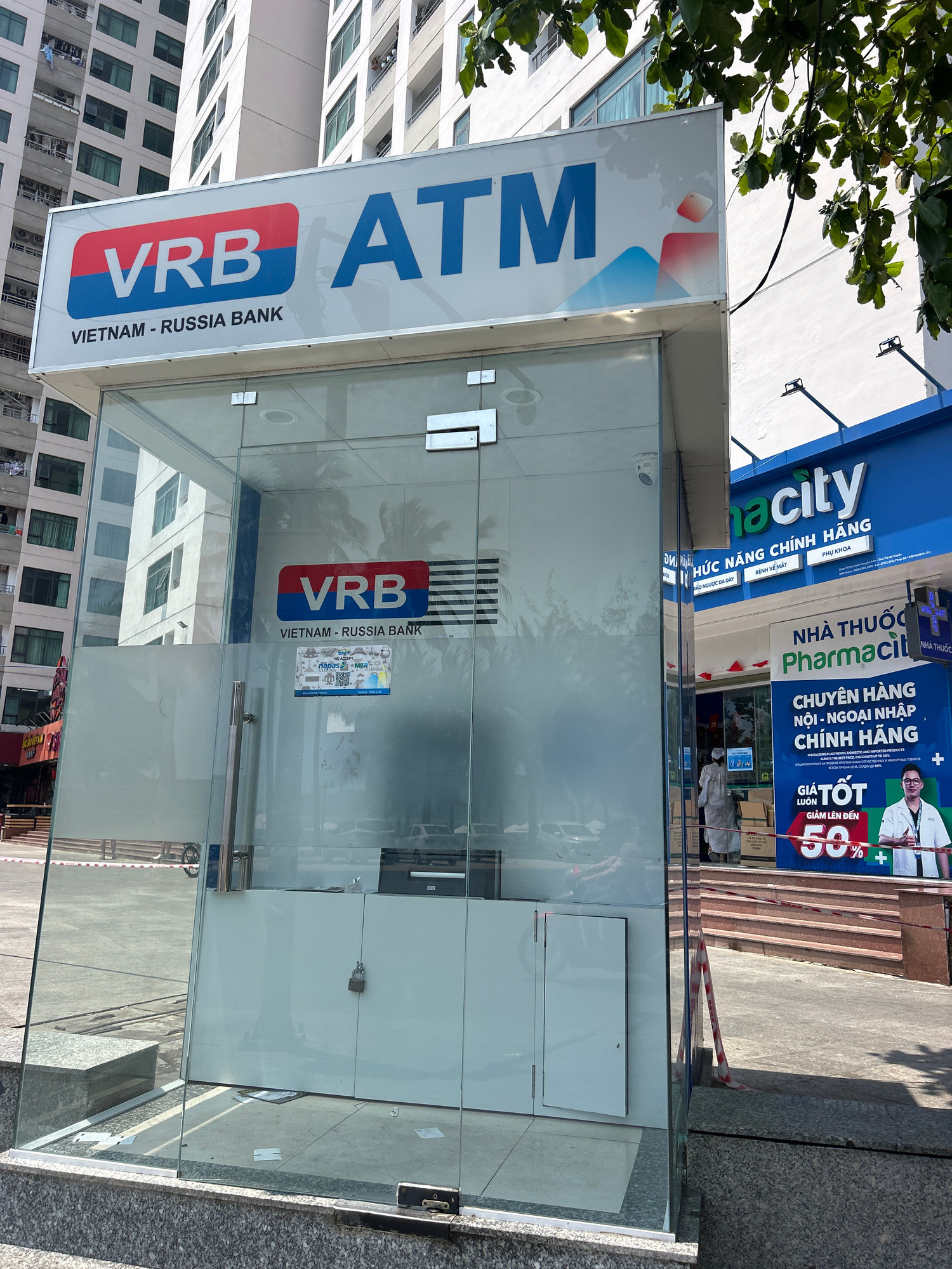 The image shows a standalone VRB ATM (Vietnam-Russia Bank) booth in Bắc Nha Trang, Vietnam. The booth is made of glass and metal, reflecting the surrounding urban landscape. Above the booth is a sign…read more