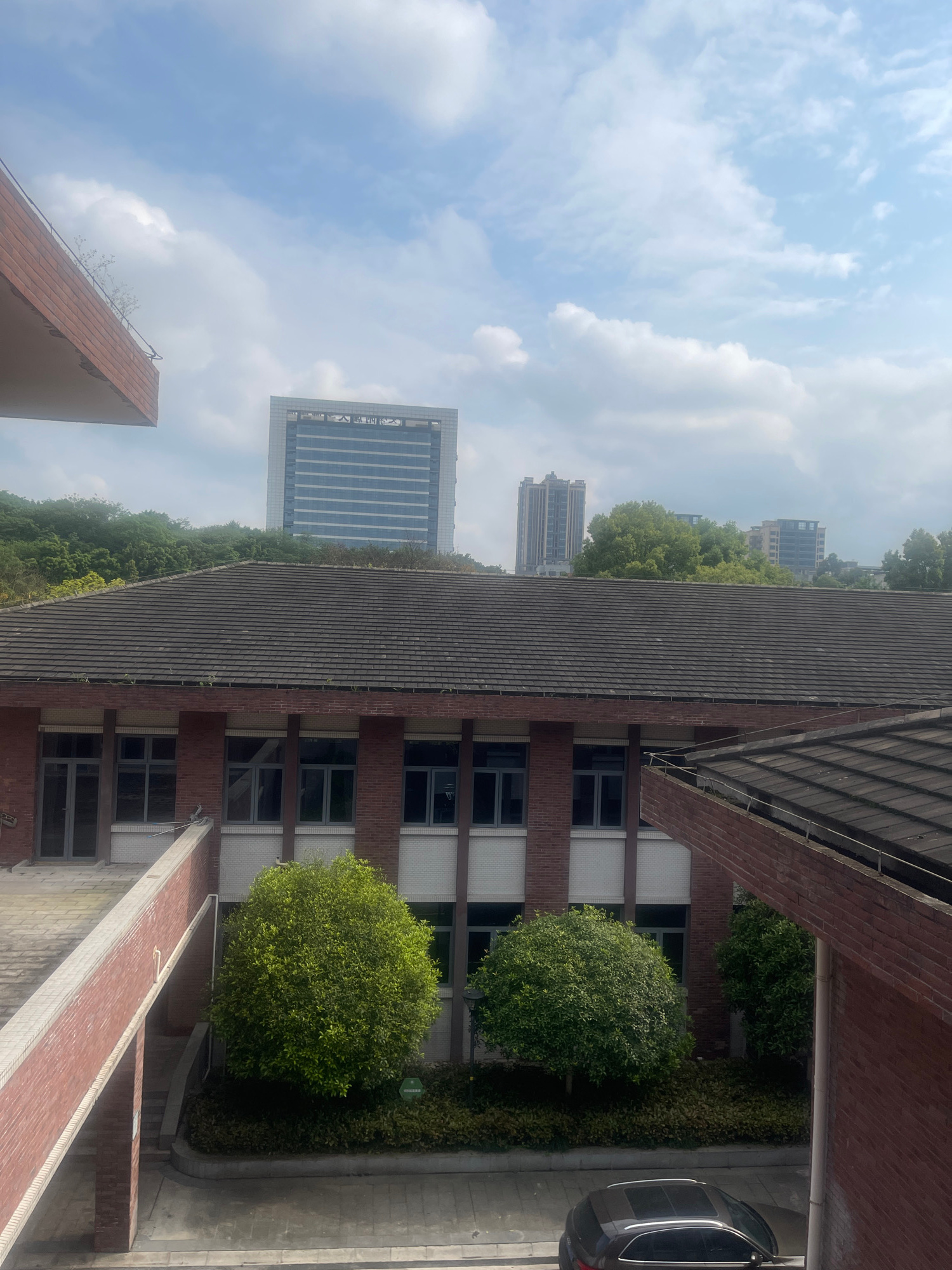 The image shows a view from an elevated position, likely a building or high ground, within the Chongqing High-tech Zone, China. The perspective is slightly tilted. Dominating the mid-ground is the roo…read more
