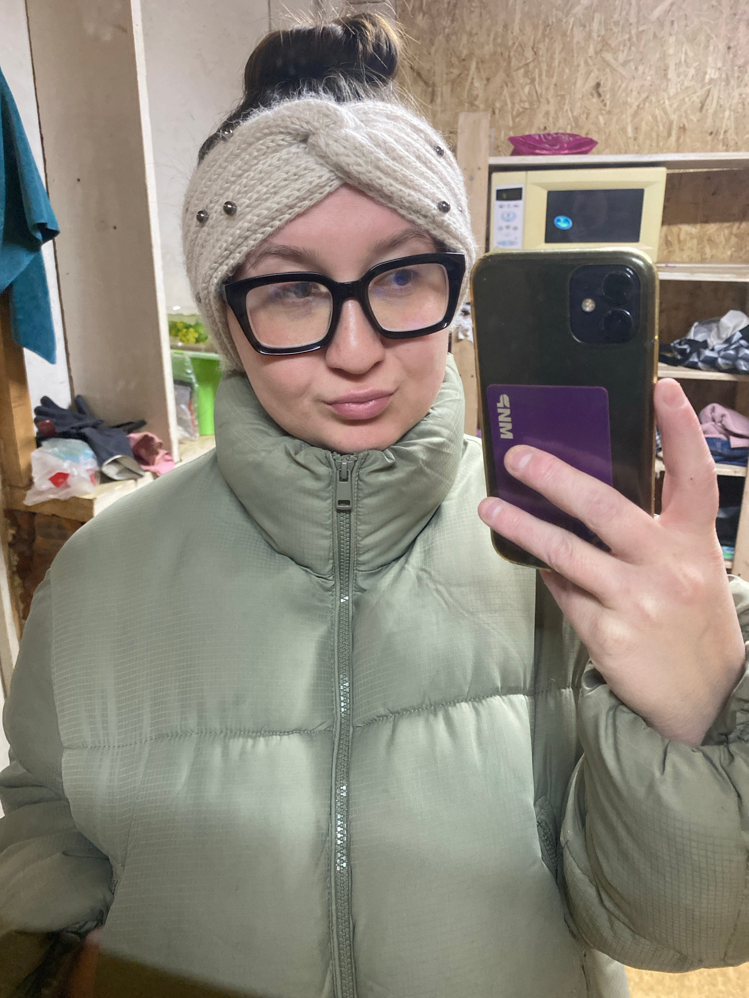 A woman is taking a selfie indoors. She wears a light green puffer jacket, a knitted headband, and black-rimmed glasses. She is holding a smartphone with a purple card attached to the back, obscuring…read more
